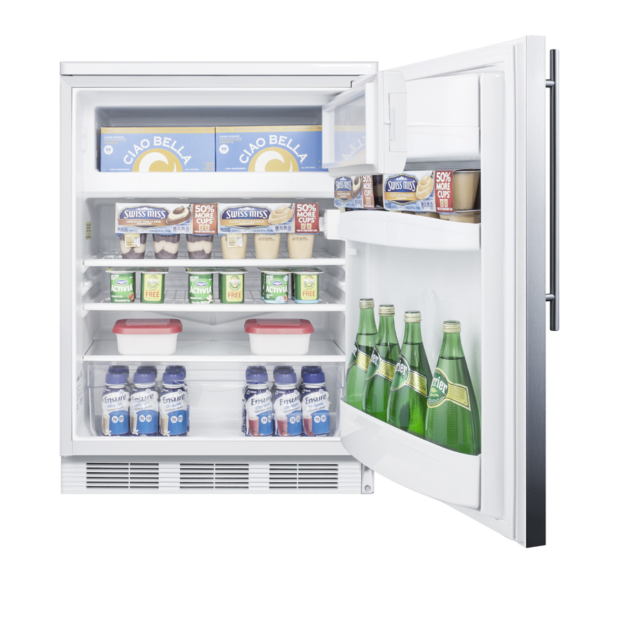Accucold by Summit Appliance offers a wide range of undercounter refrigeration for general purpose storage. The CT66JBI Series includes built-in undercounter refrigerator-freezers equipped with dual evaporator cooling for optimum storage conditions. Sized with a 24" footprint, the CT66LWBISSHV can be used built-in under counters or freestanding. The interior offers over 5 cu.ft. of storage capacity. This model has a white cabinet and reversible stainless steel wrapped door with a factory installed front lock. A thin handle with a 14mm diameter completes the sleek, modern look. Inside, our unique dual evaporator system separately cools the refrigerator and freezer section to ensure proper storage temperature. Cycle defrost operation reduces user maintenance in the automatic defrost fresh food section, with static manual defrost operation in the freezer compartment. Door storage provides easy access for tall bottles and small condiments. Additional features include adjustable shelves, a clear crisper, and automatic interior lighting. The CT66LWBISSHV has long proven itself to have one of the best temperature performance records in the industry. To see additional finish options on this unit, browse the full CT66WBI Series. Note: This product is intended for a wide variety of basic storage applications. Storage of high-value vaccines, life science materials, and medical/clinical biologicals require a product offering tighter temperature control and/or alarms, monitoring, and backup. For more information, browse Accucold's purpose-built line or contact our product specialists at 1-888-4-MED-LAB.
