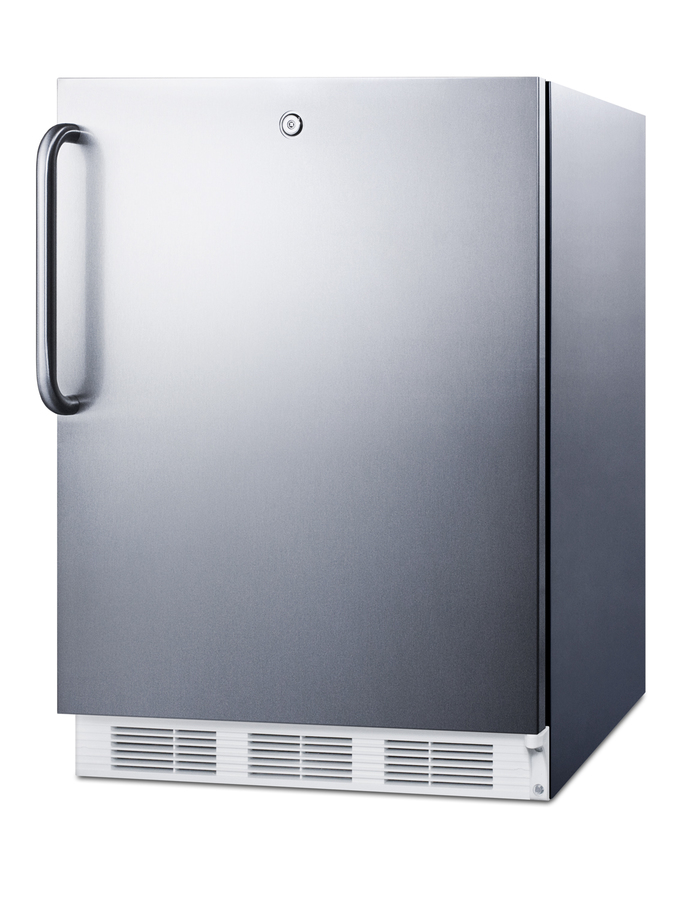 Accucold by Summit Appliance offers a wide range of undercounter refrigeration for general purpose storage. The CT66JBIADA Series includes refrigerator-freezers designed for optimum storage conditions in built-in applications under lower ADA compliant counters. At 32" high, the CT66LWCSSADA can be used built-in or freestanding in ADA compliant settings. The 24" footprint fits many popular cutouts while offering over 5 cu.ft. of storage capacity. This model has a fully wrapped stainless steel cabinet and door. A curved towel bar handle completes the professional look and a factory installed lock offers convenient security. Inside, our unique dual evaporator system separately cools the refrigerator and freezer sections to ensure proper storage temperature. Cycle defrost operation reduces user maintenance in the automatic defrost fresh food section, with static manual defrost operation in the freezer compartment. Door storage provides easy access for tall bottles and small condiments. Additional features include adjustable shelves, a clear crisper, and automatic interior lighting. The CT66LWCSSADA has long proven itself to have one of the best temperature performance records in the industry. To see additional finish options on this unit, browse the full CT66WBIADA Series. Note: This product is intended for a wide variety of basic storage applications. Storage of high-value vaccines, life science materials, and medical/clinical biologicals require a product offering tighter temperature control and/or alarms, monitoring, and backup. For more information, browse Accucold's purpose-built line or contact our product specialists at 1-888-4-MED-LAB.