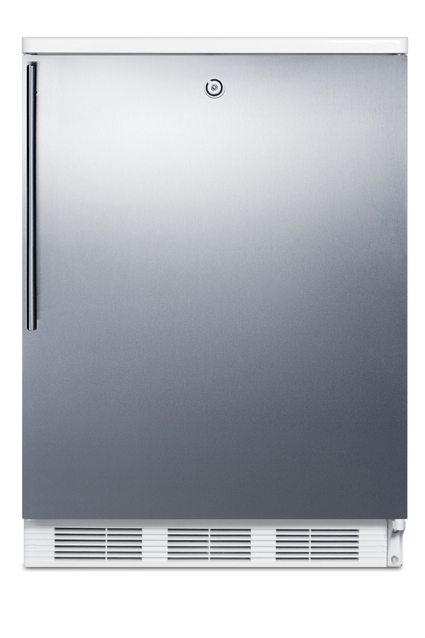 Accucold by Summit Appliance offers a wide range of counter height refrigeration for general purpose storage. The CT66J Series includes freestanding refrigerator-freezers equipped with dual evaporator cooling for optimum storage conditions. Sized with a 24" footprint, the CT66LWSSHV offers over 5 cu.ft. of storage capacity. This counter height model is designed for freestanding use. It has a white cabinet and stainless steel wrapped door with a factory installed front lock. A thin handle with a 14mm diameter completes the sleek, modern look. Inside, our unique dual evaporator system separately cools the refrigerator and freezer section to ensure proper storage temperature. Cycle defrost operation reduces user maintenance in the automatic defrost fresh food section, with static manual defrost operation in the freezer compartment. Door storage provides easy access for tall bottles and small condiments. Additional features include adjustable shelves, a clear crisper, and automatic interior lighting. The CT66LWSSHV has long proven itself to have one of the best temperature performance records in the industry. To see additional finish options on this unit, browse the full CT66 Series. For built-in undercounter applications, see the CT66LWBISSHVADA. Note: This product is intended for a wide variety of basic storage applications. Storage of high-value vaccines, life science materials, and medical/clinical biologicals require a product offering tighter temperature control and/or alarms, monitoring, and backup. For more information, browse Accucold's purpose-built line or contact our product specialists at 1-888-4-MED-LAB.