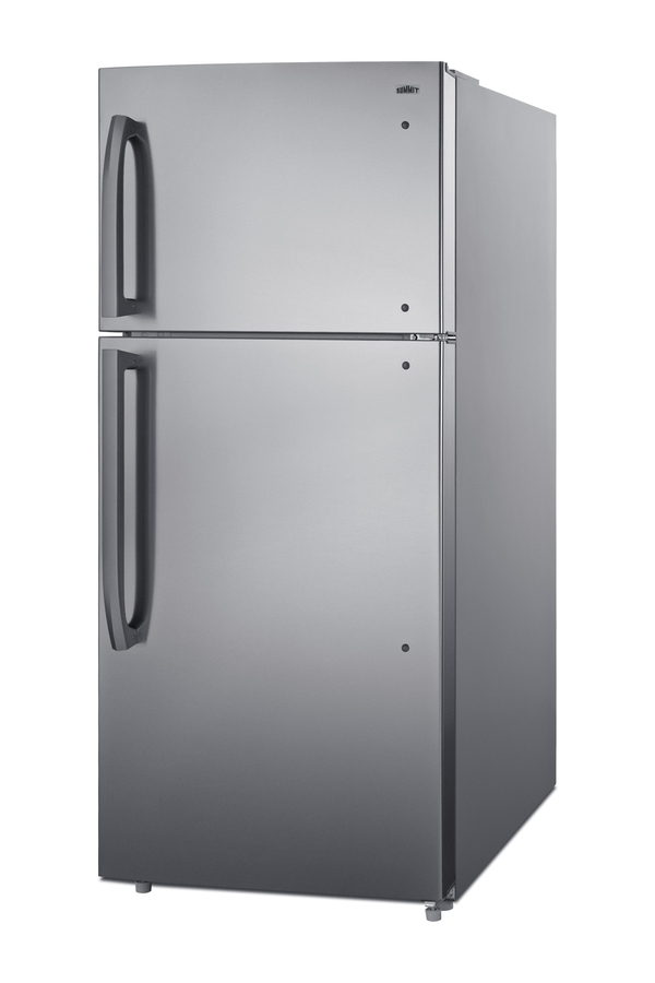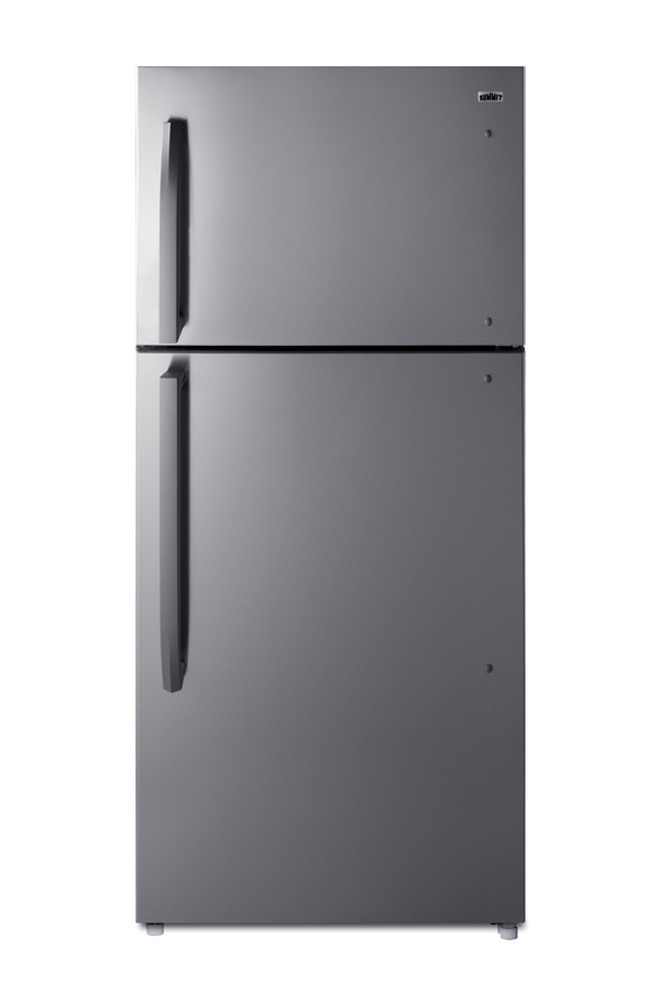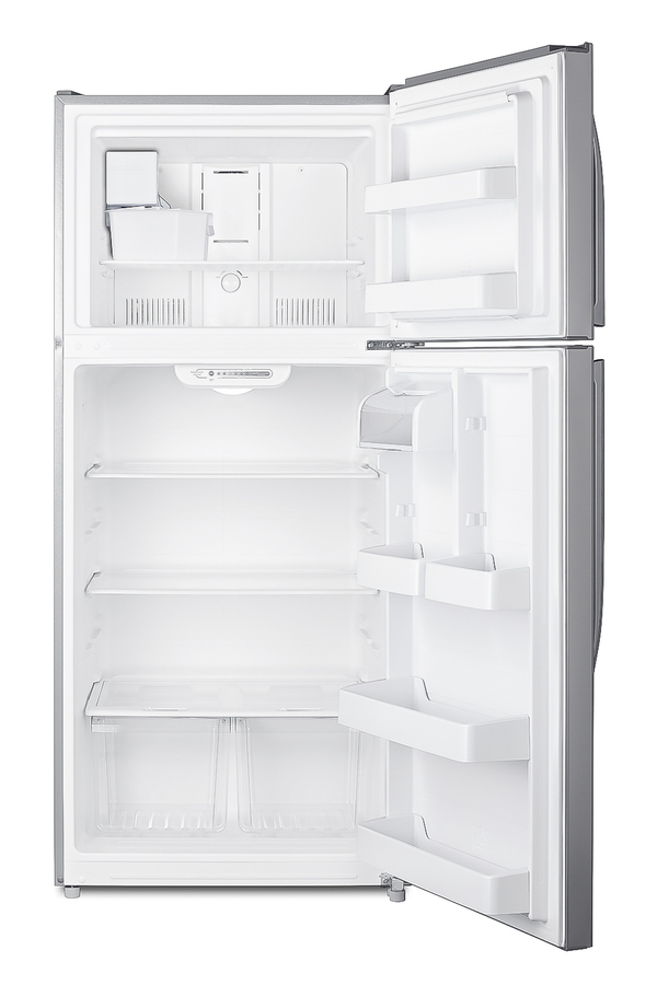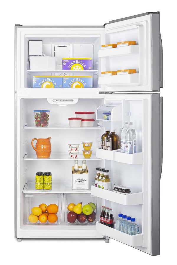 SUMMIT's selection of top freezer refrigerators offers true convenience for every kitchen, including break rooms and other general purpose facilities. The CTR18PLIM is a full-sized refrigerator-freezer. The large interior offers 18 cu.ft. of storage capacity, with frost-free operation for low maintenance use. It comes in a textured gray cabinet with user-reversible fingerprint-free doors that offer the look of stainless steel without the constant cleanup. Inside, the CTR18PLIM includes adjustable glass shelves in the refrigerator compartment and two clear crispers. The door features full-sized storage racks, including one that holds full gallon containers. Two half-sized door racks are adjustable to accommodate different sized items, with an additional fixed butter dish. The upper freezer compartment comes with a full-width wire shelf and two door bins, as well as a factory-installed icemaker. This unit includes an automatic interior LED light and easy-to-use interior thermostat.
