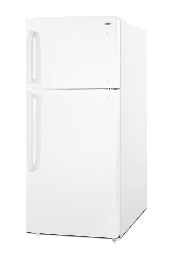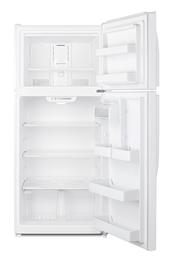 SUMMIT's selection of top freezer refrigerators offers true convenience for every kitchen, including break rooms and other general purpose facilities. The CTR18W is a full-sized refrigerator-freezer. The large interior offers 18 cu.ft. of storage capacity, with frost-free operation for low maintenance use. It comes in a clean white finish. Inside, the CTR18W includes adjustable glass shelves in the refrigerator compartment and two clear crispers. The door features full-sized storage racks, including one that holds full gallon containers. Two half-sized door racks are adjustable to accommodate different sized items, with an additional fixed butter dish. The upper freezer compartment comes with a full-width wire shelf and two door bins. This unit includes an automatic interior LED light and easy-to-use interior thermostat.