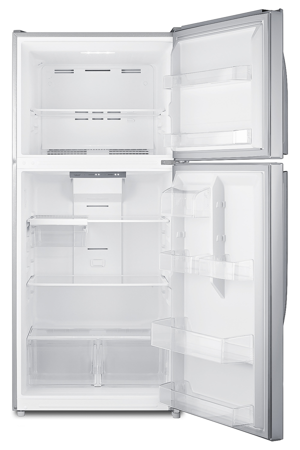 SUMMIT's selection of top freezer refrigerators offers true convenience for every kitchen, including break rooms and other general purpose facilities. The CTR21PL is a full-sized refrigerator-freezer. The large interior offers 20.5 cu.ft. of storage capacity, with frost-free operation for low maintenance use. It comes in a textured gray cabinet with user-reversible fingerprint-free doors that offer the look of stainless steel without the constant cleanup. Inside, the CTR21PL includes adjustable glass shelves in the refrigerator compartment and two clear crispers. The door features full-sized storage racks, including one that holds full gallon containers. Two half-sized door racks are adjustable to accommodate different sized items, with an additional fixed butter dish. The upper freezer compartment comes with a full-width wire shelf and two door bins. This unit includes an automatic interior LED light and easy-to-use interior thermostat. In addition to this model, Summit manufactures a variety of refrigerators for a wide variety of applications. Browse the full catalog to explore our full product line.