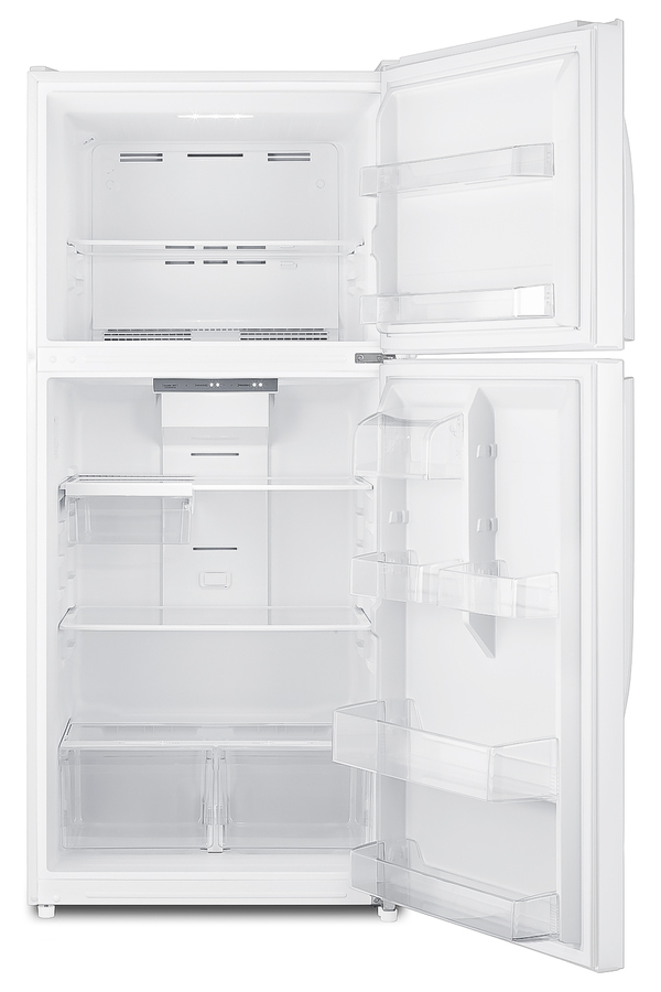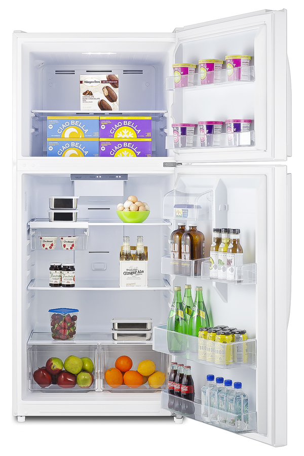 SUMMIT's selection of top freezer refrigerators offers true convenience for every kitchen, including break rooms and other general purpose facilities. The CTR21W is a full-sized refrigerator-freezer. The large interior offers 20.5 cu.ft. of storage capacity, with frost-free operation for low maintenance use. It comes in a textured white cabinet with user-reversible doors complete with easy to grab handles. Inside, the CTR21W includes adjustable glass shelves in the refrigerator compartment and two clear crispers. The door features full-sized storage racks, including one that holds full gallon containers. Two half-sized door racks are adjustable to accommodate different sized items, with an additional fixed butter dish. The upper freezer compartment comes with a full-width wire shelf and two door bins. This unit includes an automatic interior LED light and easy-to-use interior thermostat. In addition to this model, Summit manufactures a variety of refrigerators for a wide variety of applications. Browse the full catalog to explore our full product line.