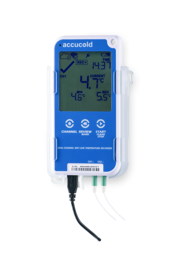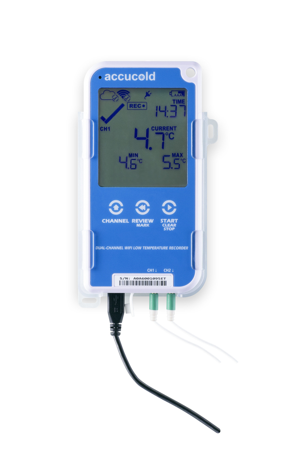 NOTE: The D22BWIFIKIT is for aftermarket installation. It ships in a single box with the following items included: temperature logger, calibrated smart probe, certificate of NIST calibration, 115V wall plug, micro USB cable, buffer bottle, wall-mount case, (2) AAA batteries, and a CR2032 backup battery. Accucold brings true convenience and trusted reliability to temperature logging with the DL22BWIFIKIT digital data logger (DDL). With a NIST calibrated probe and large display, this data logger offers all the features needed for accurate and convenient temperature monitoring in a cloud-based system compatible with WiFi or Bluetooth. The basic data plan allows you to set up 2 email addresses for temperature alerts. Through LogTag Online (LTO), you can upgrade the logger with a 12-month paid subscription that includes unlimited email addresses, SMS alerts, and WhatsApp notifications (note: maximum of 25/month for use outside the U.S.). The mobile app enables access of the paid account to record, store, and share logger data, as well as to receive alarm notifications and to view readings without a computer. Data is uploaded to the cloud in real time for immediate notifications. Reports can easily be downloaded to your device Designed for easy use with virtually any refrigerator or freezer, the DL22BWIFIKIT lets you set your own recording intervals (configurable from 30 seconds to 18 hours) for logging that meets your specific logging needs. This digital data logger can store up to 32,000 readings (16,000 per channel). Temperature accuracy is better than ±0.5°C when measuring between -20°C to +10°C, ±0.7°C for -50°C to -20°C and +10°C to +30°C, better than ±1°C for -80°C to -50°C and +30°C to +40°C, and better than ±1.8°C for -90°C to -80°C measurements. This logger includes a mounting case with adhesive for sturdy but removable connection to your cold storage equipment. The smart calibrated probe connects to a non-breakable buffer bottle filled with glass beads. It is powered by a 115V wall plug and micro USB cable (included). We include a set of AAA batteries as the backup source, allowing you to continue to log readings in the event of a power outage. With its flexible programming capabilities and user-friendly interface, the DL22BWIFIKIT creates an easy and reliable solution to temperature logging. By providing a detailed and accurate temperature record, this DDL meets CDC, VFC and VFA recommendations for logging and monitoring vaccine storage.