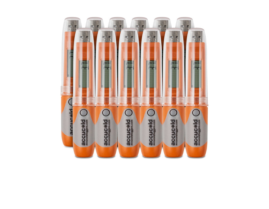 Accucold offers a range of user-friendly options for versatile and reliable temperature logging. The DLSA11CAL-12P is a set of 12 DLSA11CAL standalone temperature loggers ideal for use when transporting items that need to be monitored. The compact size makes it easy to place in the logged area without compromising capacity. The logger includes an LCD screen with a digital display of the temperature to the nearest tenth of a degree, as recommended by the CDC for vaccine storage. You can also view the average temperature and mean kinetic temperature, a simplified way of showing the overall effect of temperature fluctuation during the recording period. This unit includes a protective transparent case that allows you to view the data without disrupting recording. Designed for use with Windows-based platforms, the DLSA11CAL includes downloadable software that is easy to program to your specific needs. Users can set the recording interval from every 10 seconds to 24 hours and specify whether to display the temperature in Celsius or Fahrenheit. Users can also choose to set a minimum/maximum temperature alarm that will show a visual indicator alert if the temperature goes out of range. These readings will be color-coded in the data exports for easy analysis. The logger offers an accuracy range of .5ºC in the temperature range of -20 to 40ºC, and 1ºC outside of this range. It records all data to the internal USB drive and can hold up to 32,000 readings. When you're ready to view your data, simply plug your logger into your computer and open the software in Excel, Adobe Illustrator, or PDF format. From there, you can easily view and export the data in graphical or tabular form. These units are NIST calibrated in Accucold's ISO/IEC 17025:2017 accredited laboratory and ship with a calibration certificate for your records. All DLSA11CAL loggers include a replaceable lithium battery and a low battery alert on the LCD display. NOTE: Due to the process of calibration, there is a one week lead time on calibrated orders. For these loggers without NIST certification, see the DLSA11-12P.
