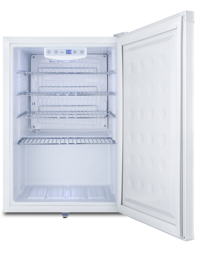 SUMMIT COMMERCIAL offers a quality line of compact refrigeration designed and constructed for reliable use in commercial applications. The FF31L7 is a compact all-refrigerator that is ETL-S listed to NSF-7 commercial standards and meets UL-471. It comes in a white exterior finish with a reversible door. A factory installed front lock offers keyed security, while the rear features a sealed metal cover for improved sanitation. Inside, the 2.5 cu.ft. FF31L7 utilizes automatic defrost operation for low maintenance use. Four removable chrome shelves offer convenient storage, while the flat door liner allows you to store deeper items. The digital thermostat is located inside and can be managed in Celsius or Fahrenheit. Interior LED lighting offers an attractive, energy efficient view of the interior in a soft blue hue. With its ideal dimensions, commercial design, and user-friendly features, the FF31L7 offers added convenience to the usual compact refrigerator. Note: This product is intended for a wide variety of basic storage applications. Storage of high-value vaccines, life science materials, and medical/clinical biologicals require a product offering tighter temperature control and/or alarms, monitoring, and backup. For more information, browse Accucold's purpose-built line or contact our product specialists at 1-888-4-MED-LAB.