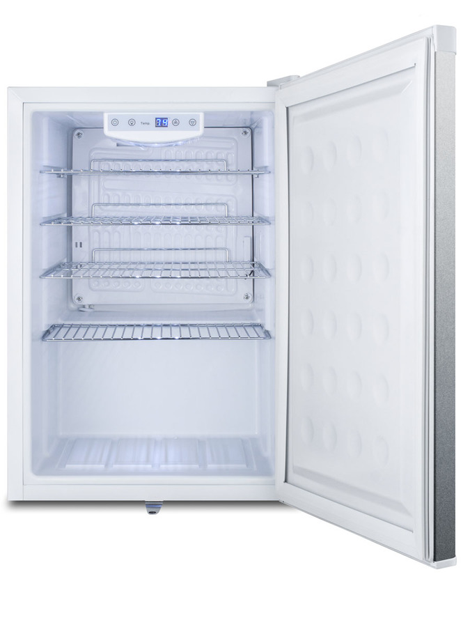 SUMMIT COMMERCIAL offers a quality line of compact refrigeration designed and constructed for reliable use in commercial applications. The FF31L7BICSS is a compact all-refrigerator that can be used built-in or freestanding. The commercial design meets UL-471 electrical standards. The unit comes with a complete stainless steel exterior for a professional look. A factory installed front lock offers keyed security, while the rear features a sealed metal cover for improved sanitation. Inside, the 2.5 cu.ft. FF31L7BICSS utilizes automatic defrost operation for low maintenance use. Four removable chrome shelves offer convenient storage, while the flat door liner allows you to store deeper items. The digital thermostat is located inside and can be managed in Celsius or Fahrenheit. Interior LED lighting offers an attractive, energy efficient view of the interior in a soft blue hue. With its ideal dimensions and user-friendly features, the FF31L7BICSS offers added convenience to the usual compact refrigerator. Note: This product is intended for a wide variety of basic storage applications. Storage of high-value vaccines, life science materials, and medical/clinical biologicals require a product offering tighter temperature control and/or alarms, monitoring, and backup. For more information, browse Accucold's purpose-built line or contact our product specialists at 1-888-4-MED-LAB.