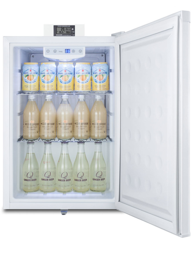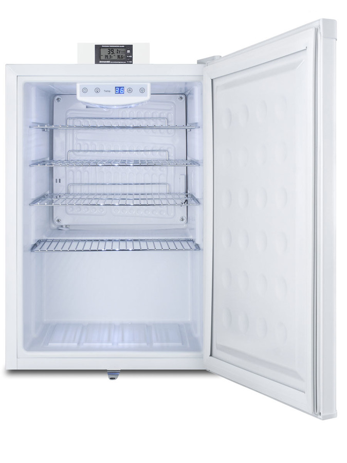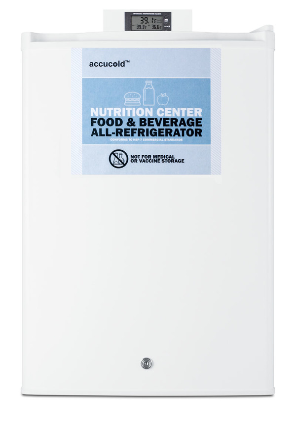 Accucold's Nutrition Center Series features commercially approved refrigerators and freezers specifically designed for the storage of sealed food and beverages in a variety of facilities, including break rooms, waiting areas, nurses' stations, and more. The FF31L7NZ is a compact all-refrigerator for countertop use. It is ETL-S listed to NSF-7 standards, with a temperature range of 35 to 39ºF ideal for sealed food and beverage storage. The top includes a continuous external display of the current and minimum/maximum temperature to the nearest tenth of a degree, making it easier for staff to monitor and record the temperature as needed. This device includes a built-in audible alarm that will sound if the unit rises or falls out of the set temperature range. The temperature probe is encased in a glycol-filled bottle to best simulate the temperature of stored contents. All temperature display devices are calibrated to NIST standards in our ISO/IEC 17025:2017 laboratory and include a certificate of calibration. Inside, the FF31L7NZ utilizes low maintenance automatic defrost operation. Four adjustable chrome shelves allow users to reconfigure the interior to accommodate a variety of sizes, with a flat door liner to allow easier storage of deeper items. The flat door liner helps to maximize the interior depth. The digital thermostat is located inside and can be managed in Celsius or Fahrenheit. Interior LED lighting offers an attractive, energy efficient view of the interior in a soft blue hue. The FF31L7NZ comes in a white exterior finish. The user-reversible door includes a front lock for keyed security. The rear features a sealed metal cover for easier cleanup, ensuring dust and other particles won't affect the cleanabililty of the exterior. Designed specifically for institutional food and beverage storage, all Accucold's Nutrition Centers are commercially approved to NSF standards and comply with most JCAHO recommendations for safe storage. Additional sizes and variations are available.