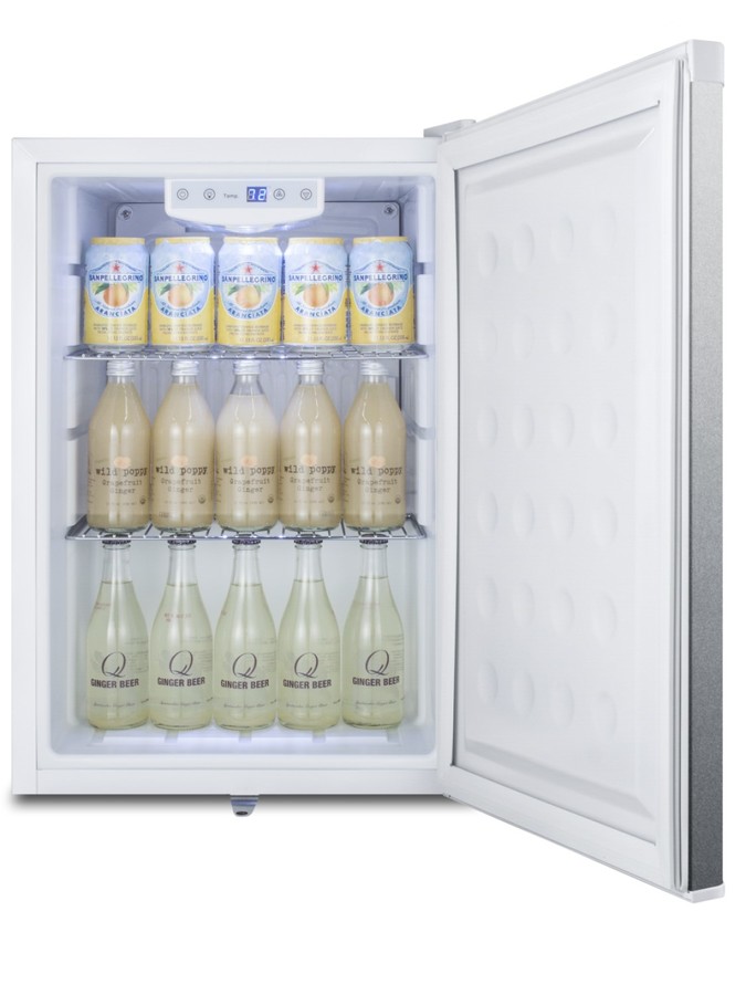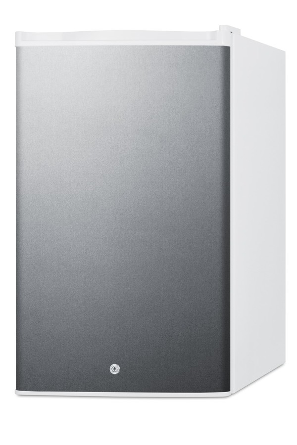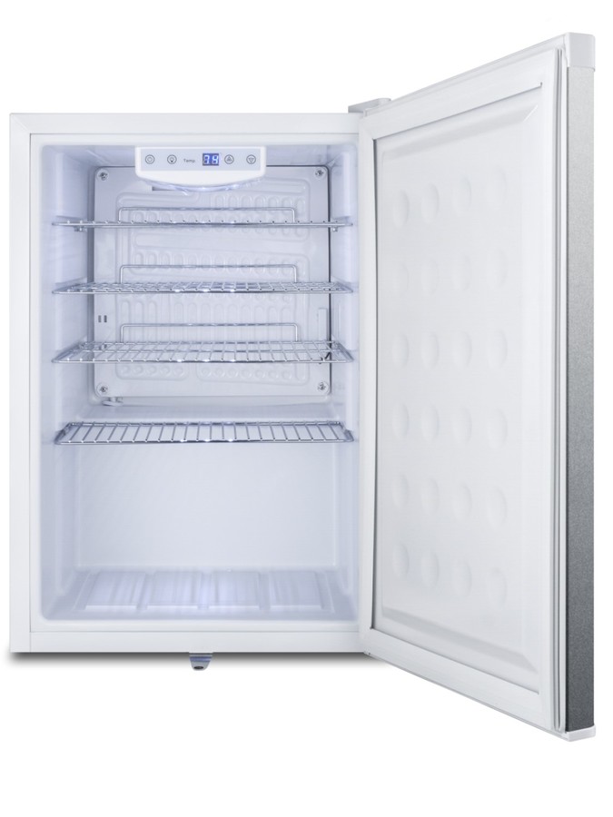 SUMMIT COMMERCIAL offers a quality line of compact refrigeration designed and constructed for reliable use in commercial applications. The FF31L7SS is a compact all-refrigerator designed to meet UL-471 standards. It comes in a white exterior finish with a reversible stainless steel door. A factory installed front lock offers keyed security, while the rear features a sealed metal cover for improved sanitation. Inside, the 2.5 cu.ft. FF31L7SS utilizes automatic defrost operation for low maintenance use. Four removable chrome shelves offer convenient storage, while the flat door liner allows you to store deeper items. The digital thermostat is located inside and can be managed in Celsius or Fahrenheit. Interior LED lighting offers an attractive, energy efficient view of the interior in a soft blue hue. With its ideal dimensions and user-friendly features, the FF31L7SS offers added convenience to the usual compact refrigerator. Note: This product is intended for a wide variety of basic storage applications. Storage of high-value vaccines, life science materials, and medical/clinical biologicals require a product offering tighter temperature control and/or alarms, monitoring, and backup. For more information, browse Accucold's purpose-built line or contact our product specialists at 1-888-4-MED-LAB.