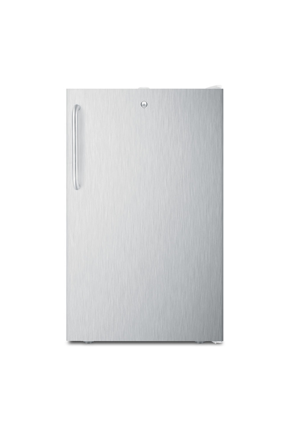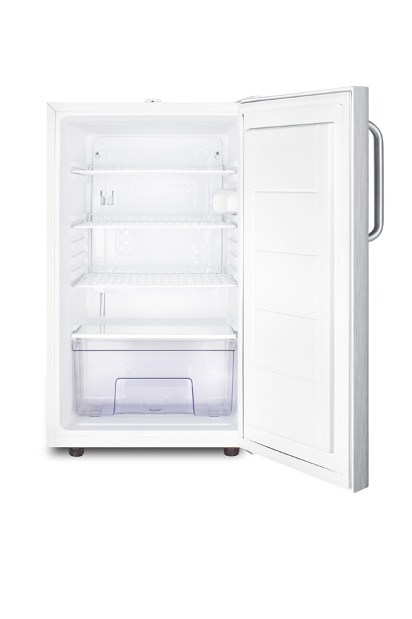 Accucold by Summit Appliance offers a wide range of counter height all-refrigerators designed for general purpose non-household storage. Model FF511LWSSTB is an all-refrigerator sized just under 20" wide, with a generous 4.1 cu.ft. capacity. This freestanding unit comes with a white exterior cabinet and stainless steel wrapped door complete with a towel bar handle. The factory-installed lock is located towards the top of the door, ensuring easier access and convenient security. We include two keys. Inside, this auto defrost refrigerator includes three adjustable wire shelves. A removable lower drawer offers added storage options as needed. This unit has a flat door liner to accept deeper trays. The interior light operates by an on/off rocker switch located next to the dial thermostat. At just 20" wide, the FF511LWSSTB is ideal for any facility in need of reliable general purpose cooling. It can be paired with the matching FS407LWSSTB freezer. Additional options with more regulated temperature stability are also available, as well as residential choices from 12" to 36" wide. Browse the complete Summit and Accucold lineup to explore our full selection of undercounter refrigeration. Note: This product is intended for a wide variety of basic storage applications. Storage of high-value vaccines, life science materials, and medical/clinical biologicals require a product offering tighter temperature control and/or alarms, monitoring, and backup. For more information, browse Accucold's purpose-built line or contact our product specialists at 1-888-4-MED-LAB.