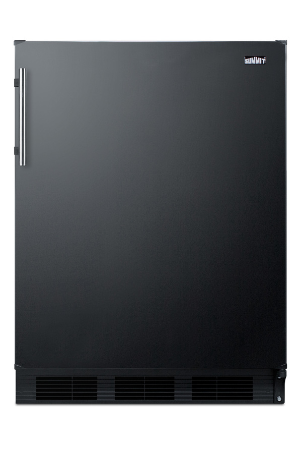Summit's Peak24 series of undercounter European-made refrigeration features energy efficient, counter height choices that offer the largest capacity in the industry. Sized with a 24" footprint, model FF63BK is an ENERGY STAR certified all-refrigerator designed for residential use. It comes in a jet black finish with a side-mounted stainless steel handle for an easy grip and attractive look. The user-reversible door lets you accommodate any space. With a full 5.8 cu.ft. interior, the Peak24 series offers a higher storage capacity than other counter height units in the market. Inside, the FF63BK utilizes automatic defrost operation to ensure minimum user maintenance. The 5.8 cu.ft. interior offers more storage space than most models in this size class. Adjustable glass shelves ensure spill-proof storage, while a large crisper drawer is ideal for keeping produce at its best. A removable wine shelf lets you keep bottles securely in place. The door includes three storage racks for condiments and tall bottles. The seamless interior also features a dial thermostat and automatic light. The FF63BK is UL listed for residential use. With its large capacity and user-friendly features, this freezerless refrigerator is a convenient option for homes, offices, schools, and other settings in need of reliable cold storage. Additional choices are available in lower ADA height, as well as with freezer compartments (model CT663BK). Browse the full Summit catalog to discover the perfect appliance for your refrigeration needs.