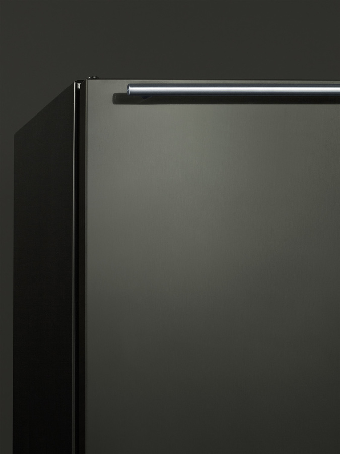 SUMMIT offers the industry’s largest selection of built-in undercounter refrigeration , with a range of choices to best suit any kitchen. The FF63BBI Series includes European made all-refrigerators designed for built-in installation in residential settings. Sized with a 24" footprint, the FF63BKBIKSHH is front-breathing for built-in use. The fully finished cabinet also allows freestanding use for added versatility, with a user-reversible door for added flexibility. The FF63BKBIKSHH comes in our new black stainless steel finish from our exclusive basalt collection. The wrapped door is made from 304 grade stainless steel with a high gloss finish in a neutral hue to perfectly accent or complement your kitchen design. The door is strongly resistant to most fingerprints and can easily be wiped clean with a dry cloth. Our signature thin handle in brushed stainless steel is mounted horizontally to complete the modern look. The FF63BKBIKSHH refrigerator utilizes automatic defrost operation to ensure minimum user maintenance. The 5.5 cu.ft. interior offers more storage space than most models in this size class. Adjustable glass shelves ensure spill-proof storage, while a large crisper drawer is ideal for keeping produce at its best. A removable wine shelf lets you keep bottles securely in place. The door includes three storage racks for condiments and tall bottles. The seamless interior also features a dial thermostat and automatic light. Designed and constructed in Europe, the FF63BKBIKSHH refrigerator offers reliable cold storage for any home looking to install a quality all-refrigerator under the counter. For additional finish options, browse the FF63BBI Series. NOTE: Black stainless steel may vary slightly in appearance from the image displayed, as it has a reflective quality that can be affected by surrounding colors and textures. Summit's black stainless steel comes with a high gloss finish and is not designed as a direct match to other brands.