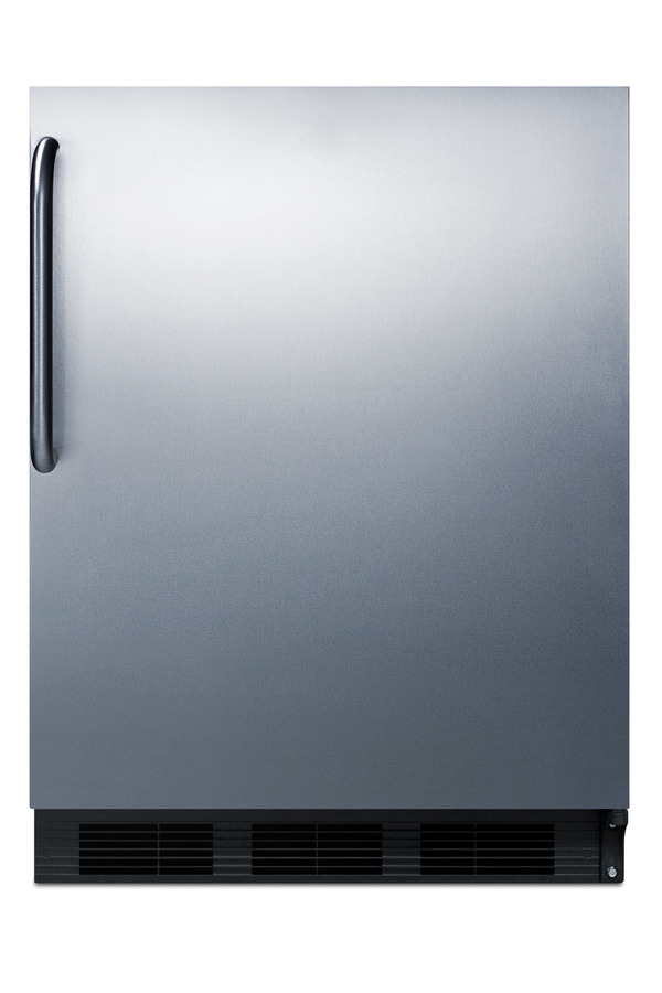 Summit's Peak24 series of undercounter European-made refrigeration features energy efficient all-refrigerators that offer the largest capacity in the industry for recessed installation in 24" openings. Sized with a 24" footprint, model FF63BKSSTB is an ENERGY STAR certified all-refrigerator designed for residential use. The stainless steel wrapped door comes with a pre-installed towel bar handle in brushed stainless steel, offering an easy grip with a professional look. The cabinet and kickplate feature a jet black finish. With a full 5.8 cu.ft. interior, the Peak24 series offers a higher storage capacity than other counter height units in the market. Inside, the FF63BKSSTB utilizes automatic defrost operation to ensure minimum user maintenance. The 5.8 cu.ft. interior offers more storage space than most models in this size class. Adjustable glass shelves ensure spill-proof storage, while a large crisper drawer is ideal for keeping produce at its best. A removable wine shelf lets you keep bottles securely in place. The door includes three storage racks for condiments and tall bottles. The seamless interior also features a dial thermostat and automatic light. The FF63BKSSTB is UL listed for residential use. With its large capacity and user-friendly features, this freezerless refrigerator is a convenient option for homes, offices, schools, and other settings in need of reliable cold storage. Additional choices are available in lower ADA height, as well as with freezer compartments (model CT663BKSSTB). Browse the full Summit catalog to discover the perfect appliance for your refrigeration needs.