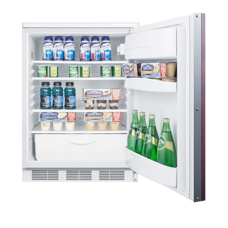 SUMMIT's FF67BI all-refrigerator offers generous storage capacity inside a deluxe interior, with commercial approval and slim undercounter dimensions for built-in use. Automatic defrost saves on time and maintenance, while SUMMIT's unique design simplifies clean-up. We use a "hidden" evaporator set behind the rear wall to create a seamless interior. This allows you to wipe down the back without having to get between crevices or touch any machinery. The commercially approved FF6LWBI7IF is designed for built-in installation under counters, but can also be used freestanding. It has a classic white cabinet with a factory reversible door capable of accepting full overlay panels, allowing users to customize the front to match other cabinetry. There are no visible seams to provide a smooth blending into the kitchen. Users provide their own handle. A front-mounted lock is installed for added security. The interior of the FF6LWBI7IF is designed for true storage convenience. Adjustable shelves, door racks, and a large crisper provide flexibility in organizing contents. Interior lighting is standard. User friendly and energy efficient, the FF6LWBI7IF can serve any commercial, medical, or household setting. NOTE: This unit is designed for general purpose storage, including certain food items, beverages, specimens, reagents, cold packs, and other non-critical materials. For storage of high-value vaccines, life science materials, and medical or clinical biologicals, browse Accucold's Medical & Laboratory or Pharmacy & Vaccine Storage categories, or contact our product specialists to discuss your options.