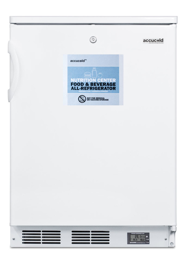 Accucold's Nutrition Center Series features commercially approved refrigerators and freezers specifically designed for the storage of sealed food and beverages in a variety of facilities, including break rooms, waiting areas, nurses' stations, and more. Made in Europe, the FF6LWBI7NZ is an all-refrigerator sized just under 24" wide and deep. It comes with a front-breathing design for built-in installation under counters, with a fully finished cabinet that also allows freestanding use. This unit is ETL-S listed to NSF-7 standards, with a temperature range of 35 to 39ºF ideal for sealed food and beverage storage. The kickplate includes a digital thermometer that provides a continuous external display of the current and minimum/maximum temperature to the nearest tenth of a degree, making it easier for staff to monitor and record the temperature as needed. This device includes a built-in audible alarm that will sound if the unit rises or falls out of the set temperature range. The temperature probe is encased in a glycol-filled bottle to best simulate the temperature of stored contents. All temperature display devices are calibrated to NIST standards in our ISO/IEC 17025:2017 laboratory and include a certificate of calibration. Inside, the FF6LWBI7NZ utilizes low maintenance automatic defrost operation. Our unique "hidden" evaporator is set behind the rear wall to create a seamless, easy-to-clean interior that also maximizes storage capacity. Adjustable wire shelves allow users to reconfigure the interior to accommodate a variety of sizes. Three fixed door racks and a removable crisper offer added storage convenience. This unit includes an interior light that automatically illuminates when the door is opened. The FF6LWBI7NZ comes in a white exterior finish with a user-reversible door swing. The factory installed lock is located towards the top of the door for easier user access. This unit includes a hospital grade cord with a 'green dot' plug that stays more securely in wall sockets, a key feature in busy institutional settings. Designed specifically for institutional food and beverage storage, all Accucold's Nutrition Centers are commercially approved to NSF standards and comply with most JCAHO recommendations for safe storage. Additional sizes and variations are available. For the same unit sized for ADA compliant counters, see the FF6LWBI7NZADA.