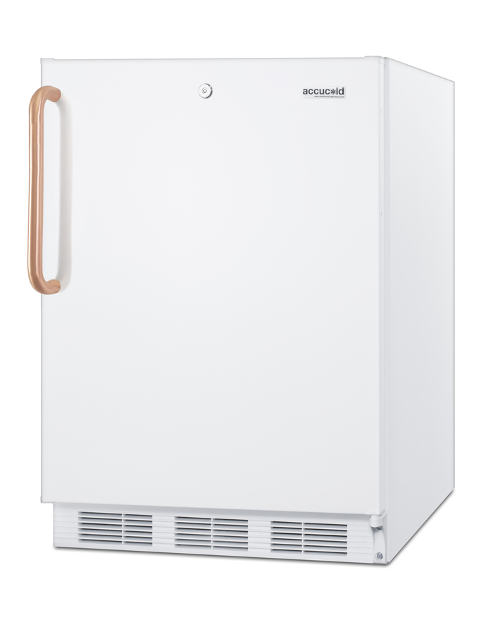 Accucold by Summit Appliance offers a quality line of refrigeration designed for healthcare applications, with pure copper handles that kill microbes. The FF6LWBI7TBCADA is a 32" high all-refrigerator with a full 5.5 cu.ft. capacity inside a slim 24" footprint. The front-breathing design allows built-in use under counters, while the fully finished cabinet also lets this unit be used freestanding. This model has a white exterior and right hand door swing. A front-mounted lock offers covnenient security. The FF6LWBI7TBCADA includes a factory-installed towel bar style handle made from pure copper. Through its natural antimicrobial properties, copper will kill microbes, including viruses, in a shorter timeframe than most other metal surfaces allowing for a safer, cleaner user experience. Inside, the FF6LWBI7TBCADA utilizes low maintenance automatic defrost operation. Our unique "hidden" evaporator is set behind the rear wall to create a seamless, easy-to-clean interior. Adjustable wire shelves allow users to reconfigure the interior for optimum storage. Additional features include automatic interior lighting, door storage, and a crisper drawer. This unit includes an adjustable dial thermostat. The FF6LWBI7TBCADA is ETL-S listed to NSF-7 standards for use in commercial establishments. For more finish options, browse the entire FF6BI7ADA Series. NOTE: This unit is designed for general purpose storage, including certain food items, beverages, specimens, reagents, cold packs, and other non-critical materials. For storage of high-value vaccines, life science materials, and medical or clinical biologicals, browse Accucold's Medical & Laboratory or Pharmacy & Vaccine Storage categories, or contact our product specialists to discuss your options.