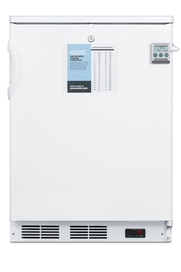 The FF6LWPLUS2 is freestanding all-refrigerator sized at just under 24" wide. Made in Europe, it comes in a white exterior finish with a keyed lock located towards the top of the door for convenient security. A digital thermostat is located in the kickplate for easy and precise temperature management. The unit uses automatic defrost operation and includes an internal fan for stabilized cooling. Adjustable wire shelves offer flexible storage inside the 5.5 cu.ft. interior, with door racks and an automatic light included. The FF6LWPLUS2 includes a thermometer calibrated to NIST standards in our ISO/IEC 17025:2017 laboratory. It displays the current, minimum, and maximum temperature to the nearest tenth degree viewable in Celsius or Fahrenheit. The buffered temperature probe is stored in a glycol-filled bottle to ensure the temperature reading best reflects the temperature of other stored refrigerator contents. The FF6LWPLUS2 can be further customized with a variety of options, including data loggers, alarms, and more. Contact our sales team for more information. Accucold's PLUS2 series refrigerators are intended for a wide variety of basic storage only. Storage of high-value vaccines, life science materials, medical, or clinical biologicals require a product with design features including, but not limited to tighter temperature controls, monitoring, and/or back-up. *NOTE: This unit's thermostat is pre-set for Celsius. If you prefer Fahrenheit, add complimentary option DTMEDF or let your sales representative know upon order.