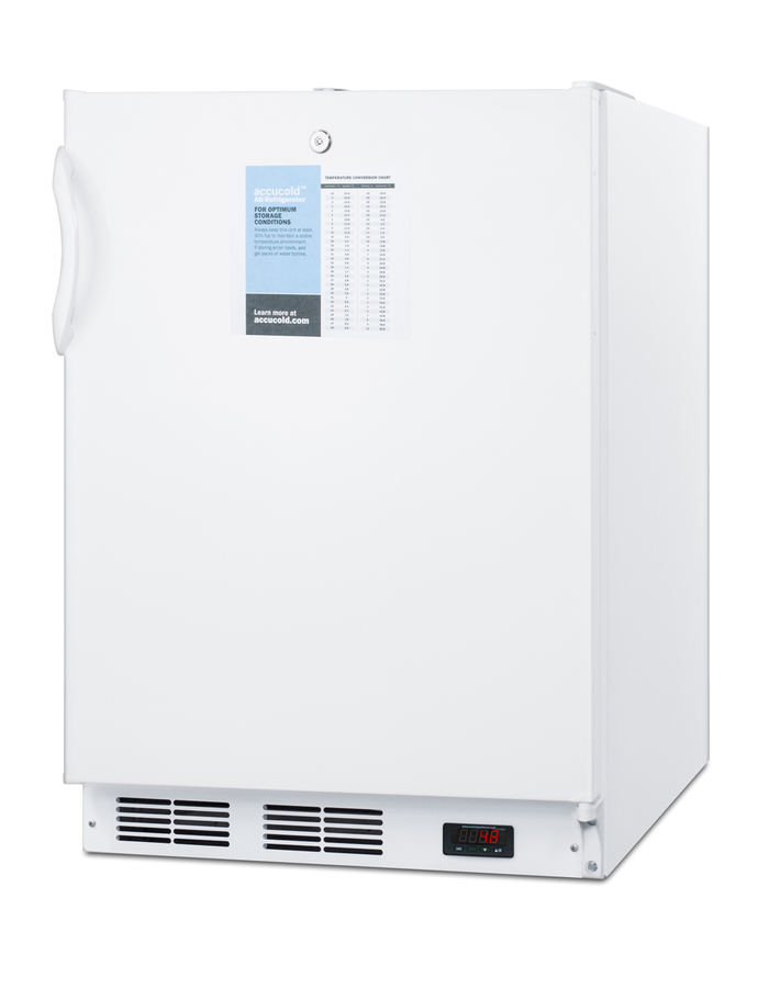 Accucold's PRO Series features all-refrigerators and all-freezers designed for reliable temperature stability in institutional settings. Sized at 32" high and just under 24" wide, the FF6LWPROADA is an all-refrigerator designed for freestanding use in settings following ADA compliant guidelines Made in Europe, it comes in a white finish with a fully finished cabinet and user-reversible door swing. A hospital grade cord with a 'green dot' plug offers added safety in high traffic areas and factory-installed lock is located towards the top of the unit for convenient security. This unit includes a digital thermostat for optimum temperature precision located in the kickplate. Inside, the FF6LWPROADA utilizes automatic defrost operation for reduced maintenance. An internal fan helps to stabilize the 5.5 cu.ft. interior temperature from top to bottom. Adjustable wire shelves and door racks offer convenient storage solutions. This unit includes an automatic interior light and a factory-installed probe hole for users to install their own temperature monitoring equipment. The FF6LWPROADA can be paired with a matching low temperature all-freezer (model VT65MLPROADA). Additional options, including NIST calibrated temperature alarms and data loggers, can also be added. Contact our product specialists for more information. *NOTE: This unit's thermostat is pre-set for Celsius. If you prefer Fahrenheit, add complimentary option DTMEDF or let your sales representative know upon order.