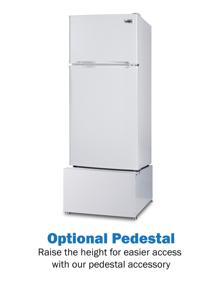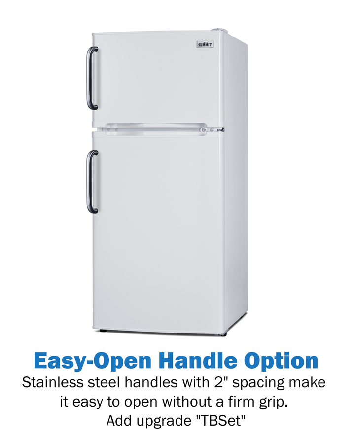 The FF712W is an ENERGY STAR certified top-mount refrigerator-freezer sized at 19” wide, with a 43" height to meet ADA guidelines for easy accessibility. It comes in a classic white finish with user-reversible doors to best accommodate any setup. To make it even more accessible, we offer a stainless steel handle upgrade ("TBSet") that allows for those with arthritis or other grip limitations to open the door more easily. We also offer compatible pedestals to raise the height and eliminate the need for users to bend down.
