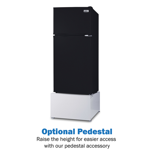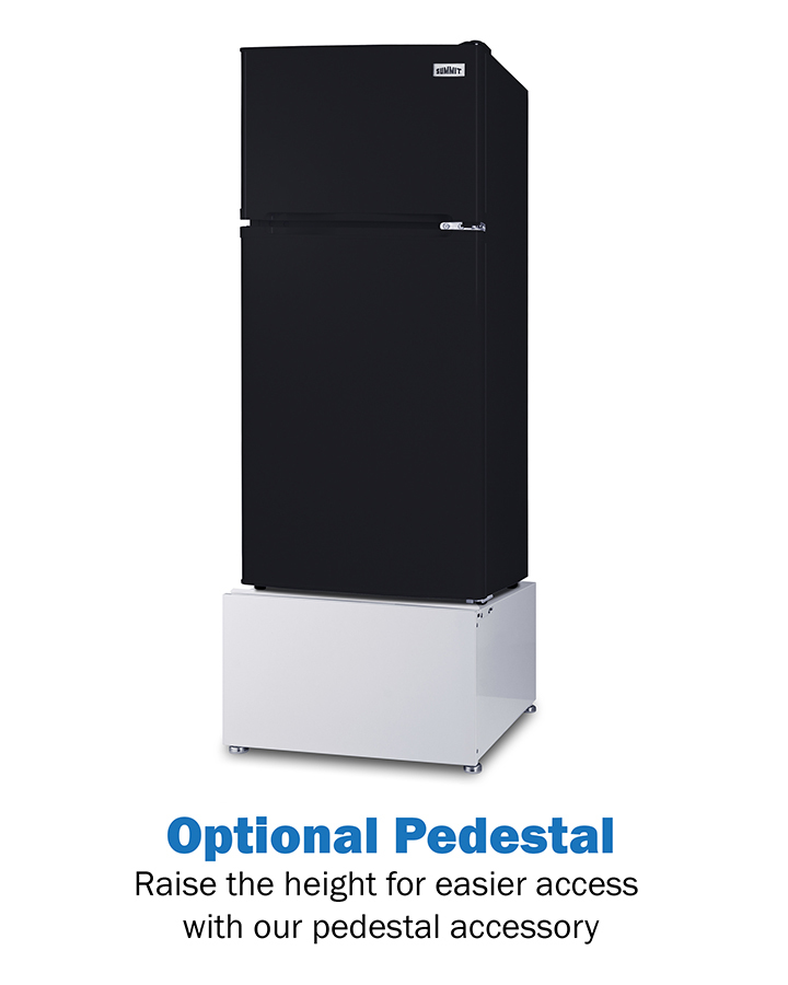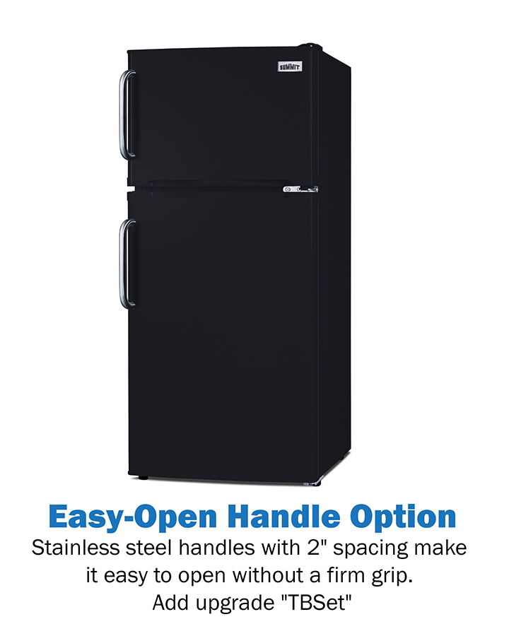 The FF713B is an ENERGY STAR-certified top-mount refrigerator-freezer sized at 19” wide, with a 43" height to meet ADA guidelines for easy accessibility. It comes in a modern black finish with user-reversible doors to best accommodate any setup. To make it even more accessible, we offer a stainless steel handle upgrade ("TBSet") that allows for those with arthritis or other grip limitations to open the door more easily. We also offer compatible pedestals to raise the height and eliminate the need for users to bend down.