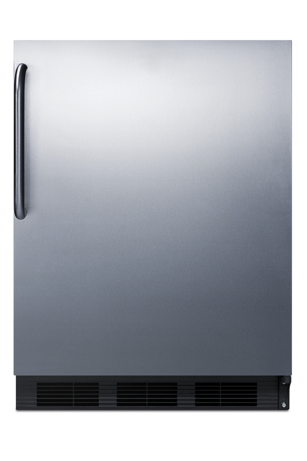 Accucold by Summit Appliance offers a wide range of all-refrigerators for general purpose storage. The commercially listed FF7BI Series features high performing, perfectly sized all-refrigerators designed for built-in use under counters. The FF7BKBISSTB features a front-breathing design that allows built-in installation under counters, while the fully finished cabinet also enables freestanding use. The 24" footprint is ideal for many common cutouts, while the full 5.5 cu.ft. interior provides more storage than most units in this size class. This unit has a black cabinet and stainless steel wrapped door. A curved towel bar handle completes the professional look. Inside, the FF7BKBISSTB utilizes low maintenance automatic defrost operation. Our unique "hidden" evaporator is set behind the rear wall to create a seamless, easy-to-clean interior that also maximizes shelf space. This unit has a flat door liner that allows it to accept larger trays (up to 19 1/2" x 16"). Adjustable glass shelves allow users to reconfigure the interior to accommodate a variety of sizes. The interior light is controlled by an on/off rocker switch located behind the thermostat dial. The FF7BKBISSTB is ETL-S listed to NSF-7 standards for use in commercial establishments. For more finish options, browse the entire FF7BI Series. NOTE: This unit is designed for general purpose storage, including certain food items, beverages, specimens, reagents, cold packs, and other non-critical materials. For storage of high-value vaccines, life science materials, and medical or clinical biologicals, browse Accucold's Medical & Laboratory or Pharmacy & Vaccine Storage categories, or contact our product specialists to discuss your options.