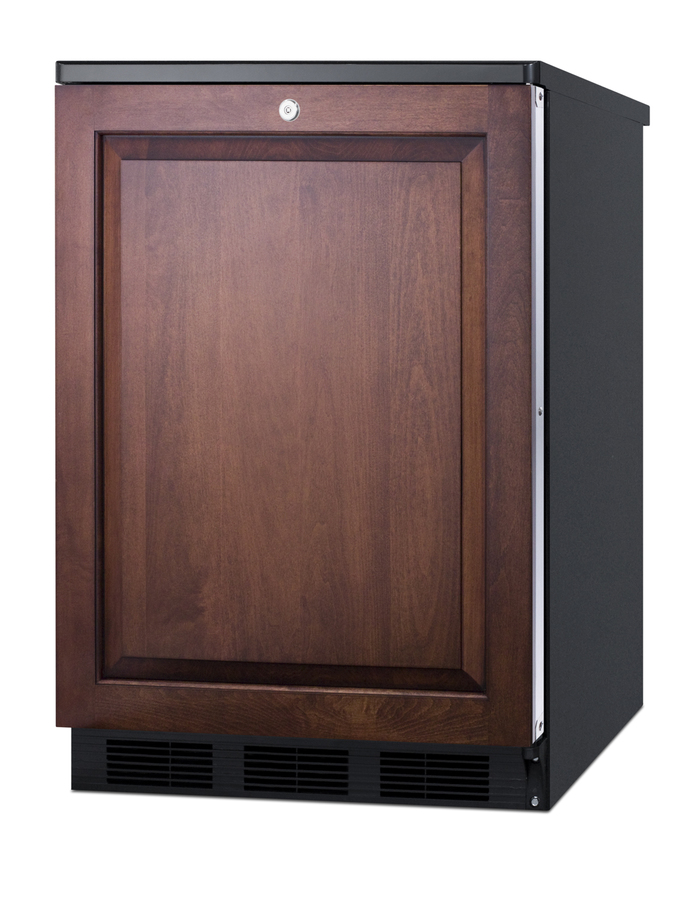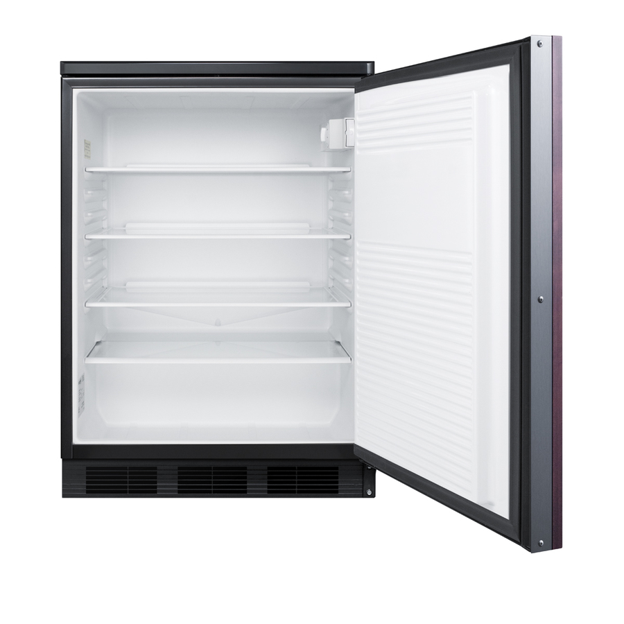 Accucold by Summit Appliance offers a wide range of all-refrigerators for general purpose storage. The commercially listed FF7BI Series features high performing, perfectly sized all-refrigerators designed for built-in use under counters. The FF7LBLKBIIF features a front-breathing design that allows built-in installation under counters, while the fully finished cabinet also enables freestanding use. The 24" footprint is ideal for many common cutouts, while the full 5.5 cu.ft. interior provides more storage than most units in this size class. This model has a black cabinet. The door includes a lock and integrated door frame designed to accept full overlay panels for a custom look. Users provide their own handle. Inside, the FF7LBLKBIIF utilizes low maintenance automatic defrost operation. Our unique "hidden" evaporator is set behind the rear wall to create a seamless, easy-to-clean interior that also maximizes shelf space. This unit has a flat door liner that allows it to accept larger trays (up to 19 1/2" x 16"). Adjustable glass shelves allow users to reconfigure the interior to accommodate a variety of sizes. The interior light is controlled by an on/off rocker switch located behind the thermostat dial. The FF7LBLKBIIF is ETL-S listed to NSF-7 standards for use in commercial establishments. For more finish options, browse the entire FF7BI Series. NOTE: This unit is designed for general purpose storage, including certain food items, beverages, specimens, reagents, cold packs, and other non-critical materials. For storage of high-value vaccines, life science materials, and medical or clinical biologicals, browse Accucold's Medical & Laboratory or Pharmacy & Vaccine Storage categories, or contact our product specialists to discuss your options.