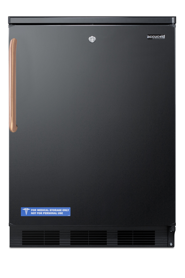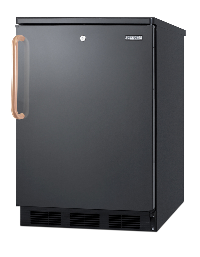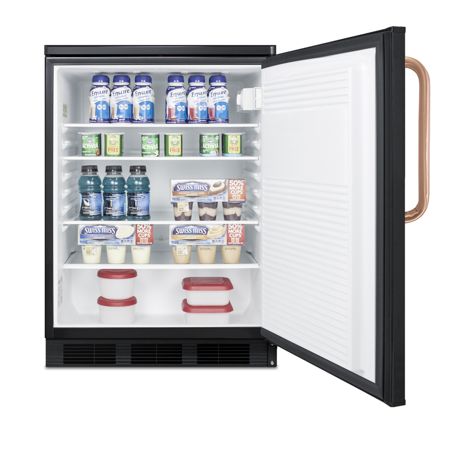 Summit Commercial offers a quality line of commercial grade refrigeration designed for healthcare applications, with pure copper handles that kill microbes. The FF7LBLKTBC is a counter height all-refrigerator with a full 5.5 cu.ft. capacity inside a slim 24" footprint. Designed for freestanding use, this model has a black exterior and a right hand door swing. A factory installed front lock offers convenient security. The FF7LBLKTBC includes a factory-installed towel bar style handle made from pure copper. Through its natural antimicrobial properties, copper will kill microbes, including viruses, in a shorter timeframe than most other metal surfaces allowing for a safer, cleaner user experience. Inside, the FF7LBLKTBC utilizes low maintenance automatic defrost operation. Our unique "hidden" evaporator is set behind the rear wall to create a seamless, easy-to-clean interior that also maximizes shelf space. This unit has a flat door liner that allows it to accept larger trays (up to 19 1/2" x 16"). Adjustable glass shelves allow users to reconfigure the interior to accommodate a variety of sizes. The interior light is controlled by an on/off rocker switch located behind the thermostat dial. The FF7LBLKTBC is ETL-S listed to NSF-7 commercial standards. For a built-in version of this unit, see the FF7LBLKBITBADA. NOTE: This unit is designed for general purpose storage, including certain food items, beverages, specimens, reagents, cold packs, and other non-critical materials. For storage of high-value vaccines, life science materials, and medical or clinical biologicals, browse Accucold's Medical & Laboratory or Pharmacy & Vaccine Storage categories, or contact our product specialists to discuss your options.