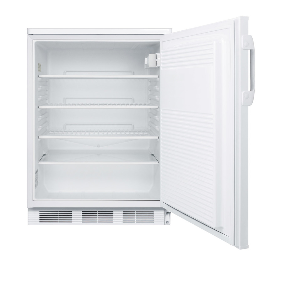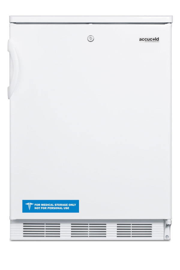 Accucold by Summit Appliance offers a wide range of all-refrigerators for general purpose storage. The commercially listed FF7 Series features high performing, perfectly sized all-refrigerators designed for freestanding use. The FF7LW is a counter height all-refrigerator with a full 5.5 cu.ft. capacity inside a slim 24" footprint. Designed for freestanding use, this model has a white exterior and user-reversible door swing. A factory installed front lock offers convenient security. Inside, the FF7LW utilizes low maintenance automatic defrost operation. Our unique "hidden" evaporator is set behind the rear wall to create a seamless, easy-to-clean interior that also maximizes shelf space. This unit has a flat door liner that allows it to accept larger trays (up to 19 1/2" x 16"). Adjustable wire shelves allow users to reconfigure the interior to accommodate a variety of sizes. The interior light is controlled by an on/off rocker switch located behind the thermostat dial. The FF7LW is ETL-S listed to NSF-7 standards for use in commercial establishments. For a built-in version of this unit, see the FF7BI. For more finish options, browse the entire FF7 Series. NOTE: This unit is designed for general purpose storage, including certain food items, beverages, specimens, reagents, cold packs, and other non-critical materials. For storage of high-value vaccines, life science materials, and medical or clinical biologicals, browse Accucold's Medical & Laboratory or Pharmacy & Vaccine Storage categories, or contact our product specialists to discuss your options.