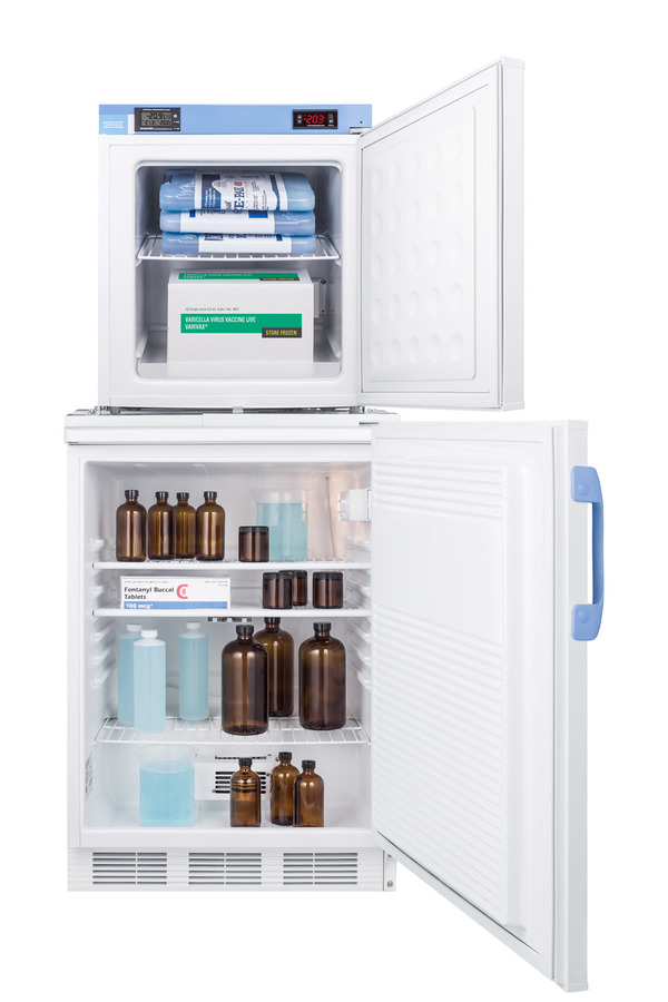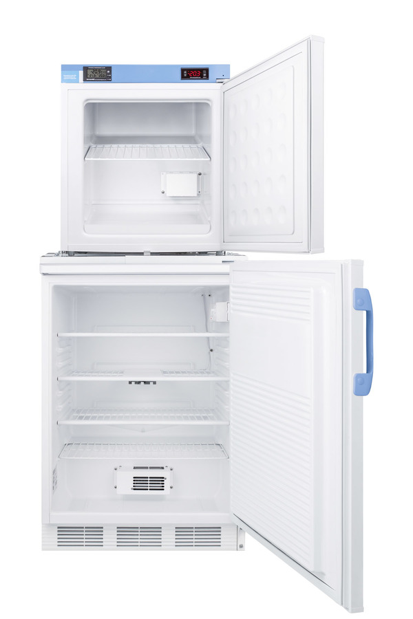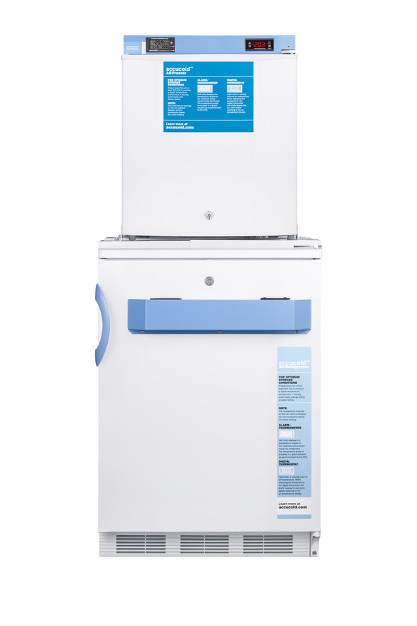 Accucold offers innovative solutions to vaccine storage with the STACKMED2 stackable refrigerator-freezer combination series. Sized just under 24" wide, the FF7LW-FS24LSTACKMED2 combines our popular FF7LWBIMED2 auto defrost all-refrigerator with the compact FS24LMED2 all-freezer in one slim footprint. Made in Europe, the FF7LWBIMED2 offers 5.5 cu.ft. of storage, with fan-forced cooling and adjustable wire shelves to ensure an even temperature distribution. The FS24LMED2 freezer utilizes static manual defrost cooling. Both units feature front-located control panels equipped with digital thermostats and NIST calibrated thermometers with high/low temperature alarms. Calibration is done in our ISO/IEC certified laboratory. The buffered temperature probes are encased in a glycol-filled bottle and secured inside the center shelf to best simulate the temperature of other stored contents, resulting in the utmost accuracy for temperature reporting. We include a pre-installed 3/8" probe hole for users who wish to install additional monitoring equipment in the rear of both units. Additional features include front locks and hospital grade cords. Products in the MED2 series come with a two year warranty on parts and labor and a five year warranty on the compressor. All Accucold STACKMED2 units ship in three boxes and require some minor assembly upon delivery. Additional stacked combinations can be created by ordering virtually any two units with our StackRack. These units can also be customized with a variety of refrigeration options, including NIST calibrated thermometers, USB data loggers, open door alarms, and much more. To create a custom combination, contact our sales team at 718-893-3900. *NOTE: Thermostats come pre-set for Celsius. If you prefer Fahrenheit, add complimentary option DTMEDF or let your sales representative know upon order.