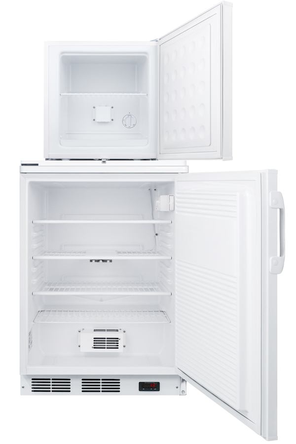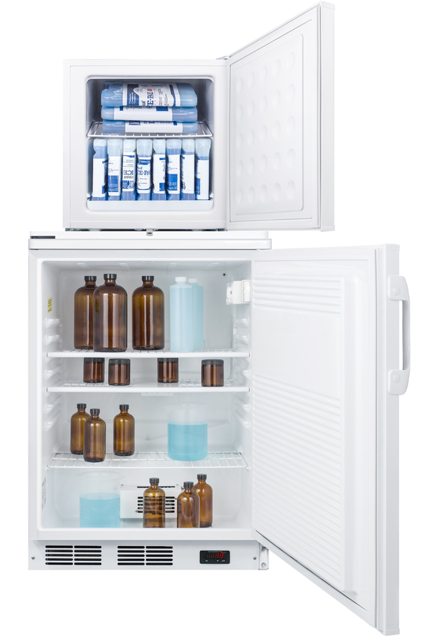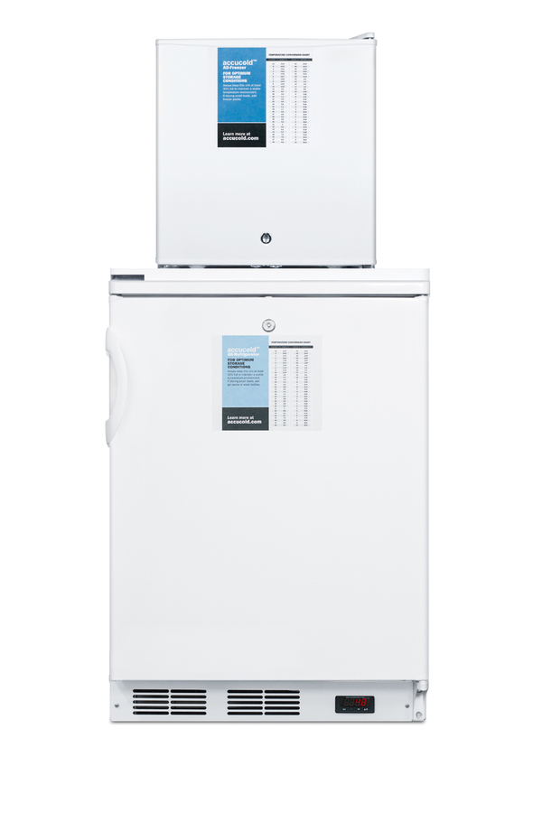 Accucold's stackable PRO series refrigerator-freezer combinations offer space-saving cooling solutions for general purpose use. Sized at just 24" wide, the FF7LW-FS24LSTACKPRO combines two slim-fitting units into one compact footprint. All-refrigerator FF7LWPRO is made in Europe and features a 5.5 cu.ft. auto defrost interior with adjustable wire shelves and a flat door liner. The digital thermostat provides easy temperature management, with an internal fan to ensure even cooling from top to bottom. Compact FS24LPRO all-freezer utilizes a static manual defrost cooling system. It includes a removable wire shelf, flat door liner, and dial thermostat. Both models include front locks for added security and user-reversible doors to accommodate various setups. Hospital grade cords with 'green dot' plugs offer added convenience for busy facilities, ensuring the cords are not easily dislodged from the wall socket. Factory-installed probe holes are included on both units to allow users to install their own monitoring devices. All Accucold STACKPRO units ship in three boxes and require some minor assembly upon delivery. Additional stacked combinations can be created by ordering virtually any two units with our StackRack. These units can also be customized with a variety of refrigeration options, including NIST calibrated thermometers, USB data loggers, open door alarms, and much more. To create a custom combination, contact our sales team at 718-893-3900. *NOTE: The refrigerator's thermostat is pre-set for Celsius. If you prefer Fahrenheit, add complimentary option DTMEDF or let your sales representative know upon order.