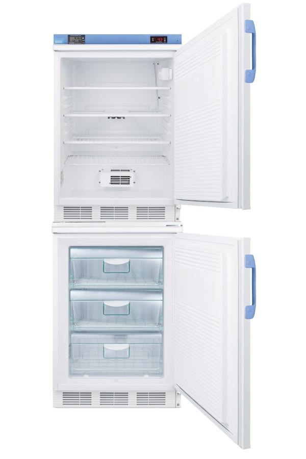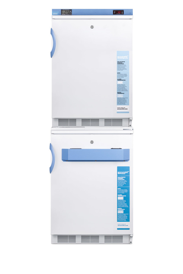 Accucold offers innovative solutions to vaccine storage with the STACKMED2 stackable refrigerator-freezer combination series. Sized just under 24" wide, the FF7LW-VT65MLSTACKMED2 combines our popular FF7LWBIMED2 auto defrost all-refrigerator with the VT65MLBIMED2 all-freezer in one slim footprint. Made in Europe, the FF7LWBIMED2 offers 5.5 cu.ft. of storage, with fan-forced cooling and adjustable wire shelves to ensure an even temperature distribution. Model VT65MLBIMED2 is a low temperature all-freezer complete with interior drawers to ensure stored items are protected from ambient temperature when the door is open. Both units feature front-located control panels equipped with digital thermostats and NIST calibrated thermometers with high/low temperature alarms. Calibration is done in our ISO/IEC certified laboratory. The buffered temperature probes are encased in a glycol-filled bottle and secured inside the center shelf to best simulate the temperature of other stored contents, resulting in the utmost accuracy for temperature reporting. We include a pre-installed 3/8" probe hole for users who wish to install additional monitoring equipment in the rear of both units. Additional features include front locks and hospital grade cords. Products in the MED2 series come with a two year warranty on parts and labor and a five year warranty on the compressor. All Accucold STACKMED2 units ship in three boxes and require some minor assembly upon delivery. Additional stacked combinations can be created by ordering virtually any two units with our StackRack. These units can also be customized with a variety of refrigeration options, including NIST calibrated thermometers, USB data loggers, open door alarms, and much more. To create a custom combination, contact our sales team at 718-893-3900. *NOTE: Thermostats come pre-set for Celsius. If you prefer Fahrenheit, add complimentary option DTMEDF or let your sales representative know upon order.