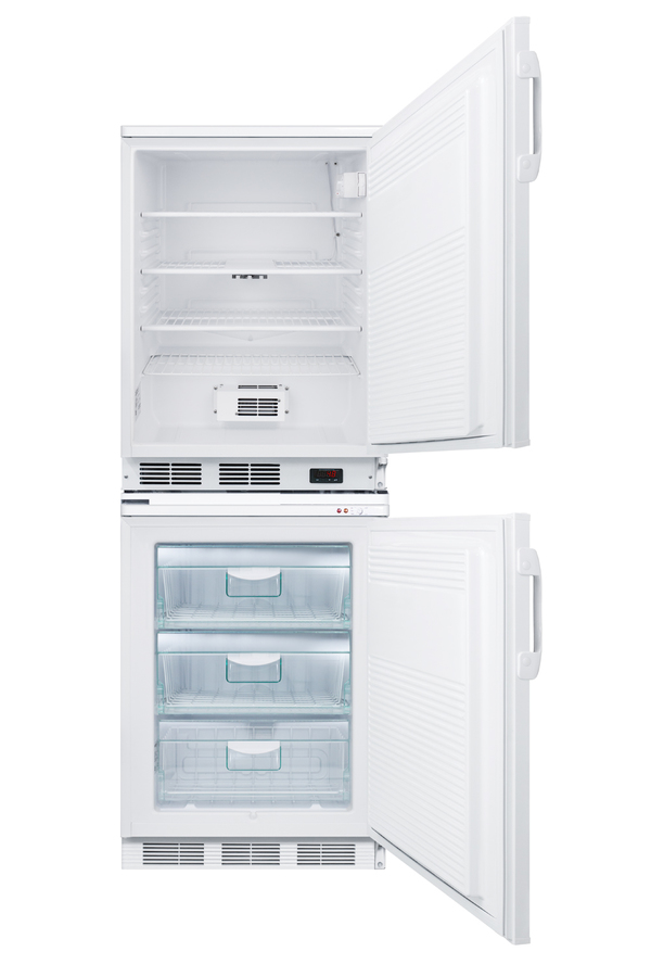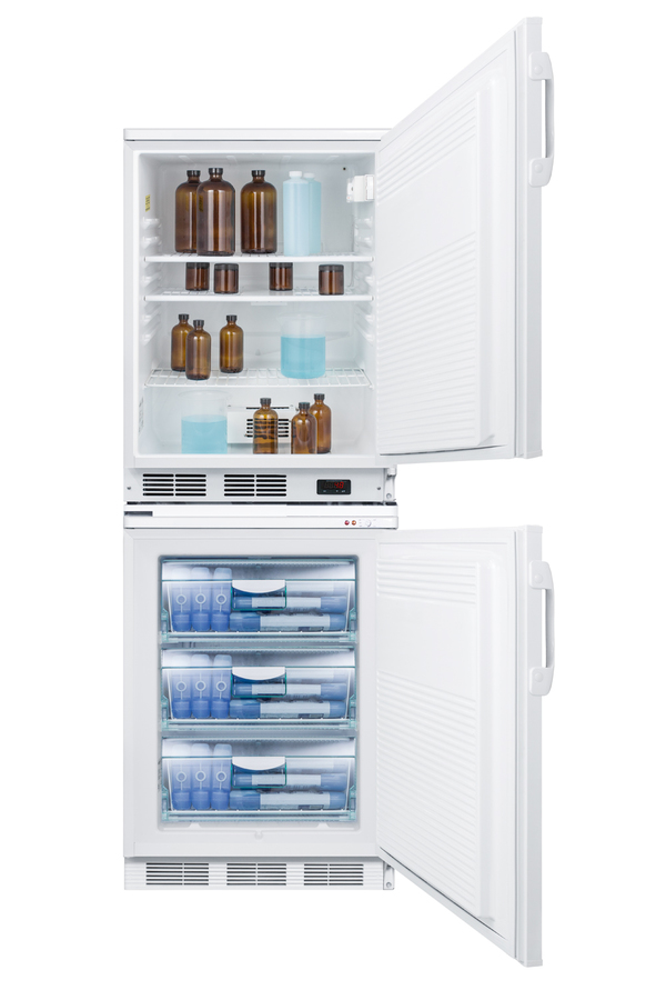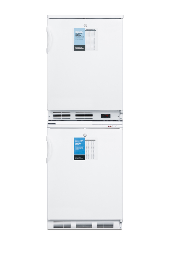 Accucold's stackable PRO series refrigerator-freezer combinations offer space-saving cooling solutions for general purpose use. Sized at just 24" wide, the FF7LW-VT65MLSTACKPRO combines two slim-fitting units into one compact footprint. All-refrigerator FF7LWPRO is made in Europe and features a 5.5 cu.ft. auto defrost interior with adjustable wire shelves and a flat interior door liner. The digital thermostat provides easy temperature management, with an internal fan to ensure even cooling from top to bottom. The matching VT65MLPRO all-freezer utilizes a static manual defrost cooling system for low temperature operation, with slide-out baskets for easy storage that stays protected from ambient temperature when the door is opened. It includes a dial thermostat located in the tabletop. Both models include front locks for added security and user-reversible doors to accommodate various setups. Hospital grade cords with 'green dot' plugs offer added convenience for busy facilities, ensuring the cords are not easily dislodged from the wall socket. Factory-installed probe holes are included on both units to allow users to install their own monitoring devices. All Accucold STACKPRO units ship in three boxes and require some minor assembly upon delivery. Additional stacked combinations can be created by ordering virtually any two units with our StackRack. These units can also be customized with a variety of refrigeration options, including NIST calibrated thermometers, USB data loggers, open door alarms, and much more. To create a custom combination, contact our sales team at 718-893-3900. *NOTE: The refrigerator's thermostat is pre-set for Celsius. If you prefer Fahrenheit, add complimentary option DTMEDF or let your sales representative know upon order.