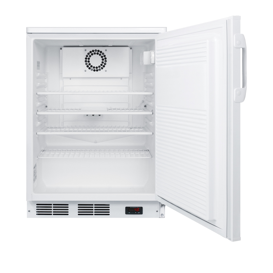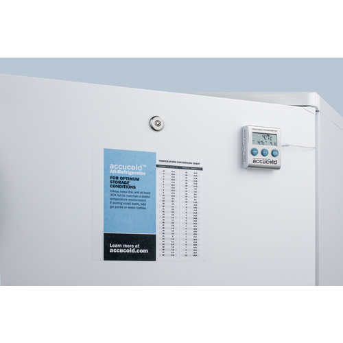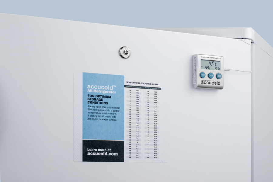 The FF7LWBIPLUS2 is a commercially approved all-refrigerator sized at just under 24" wide. Made in Europe, it comes in a white exterior finish with a keyed lock located towards the top of the door for convenient security. The front-breathing system allows built-in installation under counters, while the fully finished cabinet also enables freestanding use. A digital thermostat is located in the kickplate for easy and precise temperature management. The unit uses automatic defrost operation and includes an internal fan for stabilized cooling. Adjustable wire shelves offer flexible storage inside the 5.5 cu.ft. interior, with a flat door liners as recommended by the CDC. The FF7LWBIPLUS2 includes a thermometer calibrated to NIST standards in our ISO/IEC 17025:2017 laboratory. It displays the current, minimum, and maximum temperature to the nearest tenth degree viewable in Celsius or Fahrenheit. The buffered temperature probe is stored in a glycol-filled bottle to ensure the temperature reading best reflects the temperature of other stored refrigerator contents. The FF7LWBIPLUS2 is ETL-S listed to NSF-7 commercial standards. It can be further customized with a variety of options, including data loggers, alarms, and more. Contact our sales team for more information. Accucold's PLUS2 series refrigerators are intended for a wide variety of basic storage only. Storage of high-value vaccines, life science materials, medical, or clinical biologicals require a product with design features including, but not limited to tighter temperature controls, monitoring, and/or back-up. *NOTE: This unit's thermostat is pre-set for Celsius. If you prefer Fahrenheit, add complimentary option DTMEDF or let your sales representative know upon order.