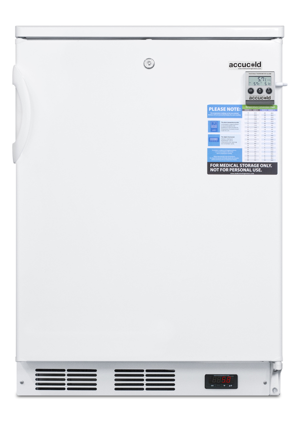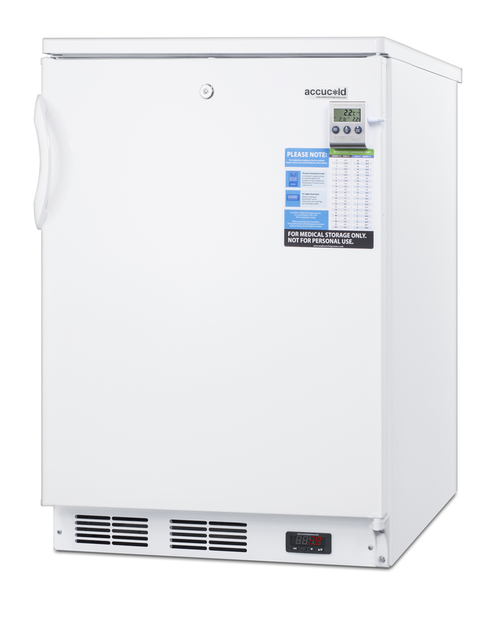 The Accucold® VAC Series refrigerators are specially designed to store sensitive medical and pharmaceutical materials under the proper conditions, with innovative construction for temperature stability and user-friendly features for added convenience. Sized with a 24" footprint, the FF7LWBIVAC is an all-refrigerator that can be used built-in or freestanding. The automatic defrost interior is equipped with fan-forced cooling to ensure even temperature distribution from top to bottom. Three slide-out wire basket drawers make it easy to organize the interior while the plastic drawer fronts help to shield stored contents from being exposed to room temperature when the door is open. As recommended by the CDC for vaccine storage, this unit has a flat interior door liner. The FF7LWBIVAC includes a factory installed front lock for added security. The self-closing door is an ideal feature for lab or medical settings, helping to protect valuable samples and vaccines when a busy staff may not always have time to ensure a tight seal. The hospital grade 'green dot' cord offers added safety in high-traffic locations. For temperature precision, the FF7LWBIVAC includes a digital thermostat. A high/low temperature alarm sends an audible alert if the unit is out of set range, while also displaying a NIST calibrated temperature readout to the nearest tenth of a degree. A pre-installed probe hole/access port allows users to install additional monitoring equipment. In addition to the standard features of the VAC line, the FF7LWBIVAC can be further customized to your exact specifications. Additional options include temperature loggers, keypad locks, open door alarms, door reversals, and more. For more information, call our office to discuss your complete medical refrigeration needs with our sales team. This unit is also available in a 32" height for use under lower counters complying with ADA guidelines (see the FF7LWBIVACADA). NOTE: Accucold refrigerators are purpose-built to the support meeting the current CDC (Centers for Disease Control) guidelines for the storage of vaccines. At this time, Accucold refrigerators have not been evaluated to the new NSF 456 standard. As referenced in the current Vaccine Storage and Handling Toolkit, these units incorporate microprocessor controls and forced air circulation for stable operation between 2 and 8ºC. For additional temperature assurance, the CDC recommends a calibrated digital data logger (DDL), which can be added with the factory-installed option DL2B or addition of the DL2BKit accessory.