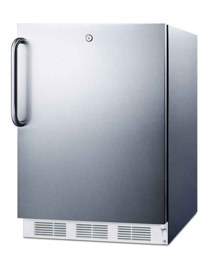 Accucold by Summit Appliance offers a wide range of all-refrigerators for general purpose storage. The commercially listed FF7BI Series features high performing, perfectly sized all-refrigerators designed for built-in use under counters. The FF7LWCSS features a front-breathing design that allows built-in installation under counters, while the fully finished cabinet also enables freestanding use. The 24" footprint is ideal for many common cutouts, while the full 5.5 cu.ft. interior provides more storage than most units in this size class. This unit comes in a fully wrapped stainless steel finish. A curved towel bar handle completes the professional look and a factory installed front lock offers convenient security. Inside, the FF7LWCSS utilizes low maintenance automatic defrost operation. Our unique "hidden" evaporator is set behind the rear wall to create a seamless, easy-to-clean interior that also maximizes shelf space. This unit has a flat door liner that allows it to accept larger trays (up to 19 1/2" x 16"). Adjustable wire shelves allow users to reconfigure the interior to accommodate a variety of sizes. The interior light is controlled by an on/off rocker switch located behind the thermostat dial. The FF7LWCSS is ETL-S listed to NSF-7 standards for use in commercial establishments. For more finish options, browse the entire FF7BI Series. NOTE: This unit is designed for general purpose storage, including certain food items, beverages, specimens, reagents, cold packs, and other non-critical materials. For storage of high-value vaccines, life science materials, and medical or clinical biologicals, browse Accucold's Medical & Laboratory or Pharmacy & Vaccine Storage categories, or contact our product specialists to discuss your options.