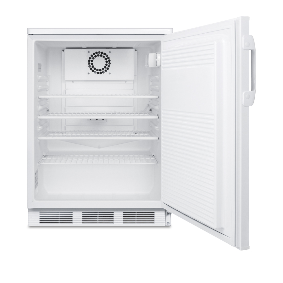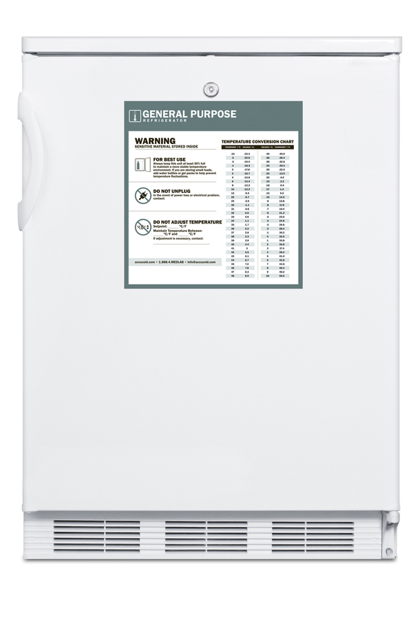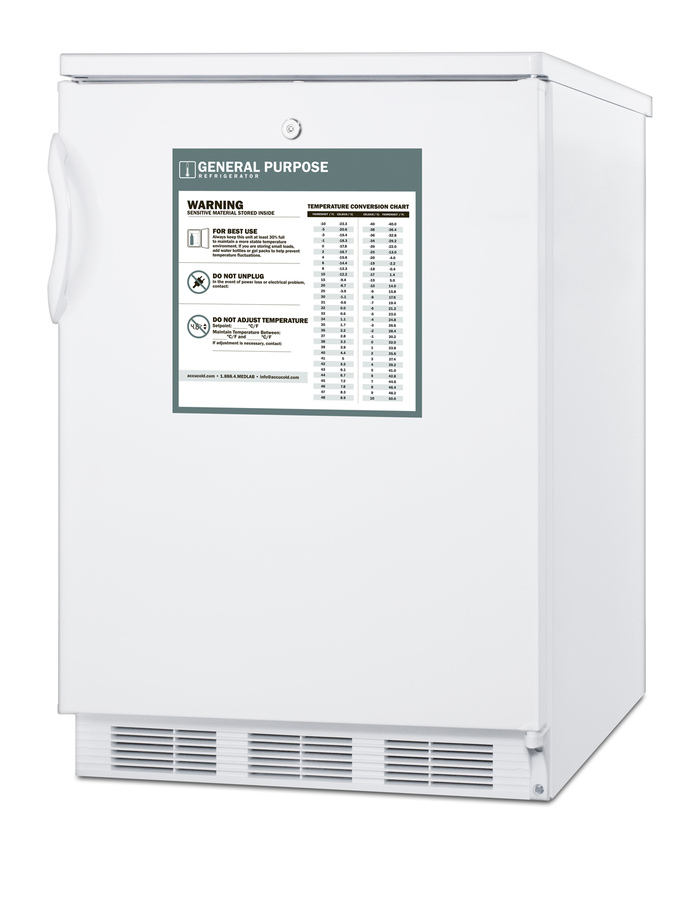 Accucold's series of general purpose refrigeration includes a variety of choices ideal for use in healthcare applications. The FF7LWGPC is a counter height all-refrigerator designed to offer an improved performance over similarly sized dorm fridges and residential units. It comes in a slim 24 inch footprint with a large 5.5 cu.ft. interior. This model has a white exterior and user-reversible door swing. A factory installed front lock is located towards the top of the door to offer convenient security. Inside, the FF7LWPGC utilizes low maintenance automatic defrost operation. Our unique "hidden" evaporator is set behind the rear wall to create a seamless, easy-to-clean interior that also maximizes shelf space. This unit has a flat door liner that allows it to accept larger trays (up to 19 1/2" x 16"). Adjustable wire shelves allow users to reconfigure the interior to accommodate a variety of sizes. The interior light is controlled by an on/off rocker switch. An internal fan ensures proper cold air circulation throughout the unit. The FF7LWGPC is ETL-S listed to NSF-7 standards for use in commercial establishments. It is a convenient solution to general purpose cold storage applications. Additional general purpose choices are available as freezers and in undercounter, ADA compliant, and large capacity sizes. This unit is designed for general purpose or commercial applications and does not meet DOE energy standards for residential use. Note: Accucold's general purpose series refrigerators are intended for a wide variety of basic storage of non-critical products. For storage of high-value vaccines, life science materials, and medical or clinical biologicals, browse Accucold's Medical & Laboratory or Pharmacy & Vaccine Storage categories, or contact our product specialists to discuss your options at 1-888-4-MED-LAB.