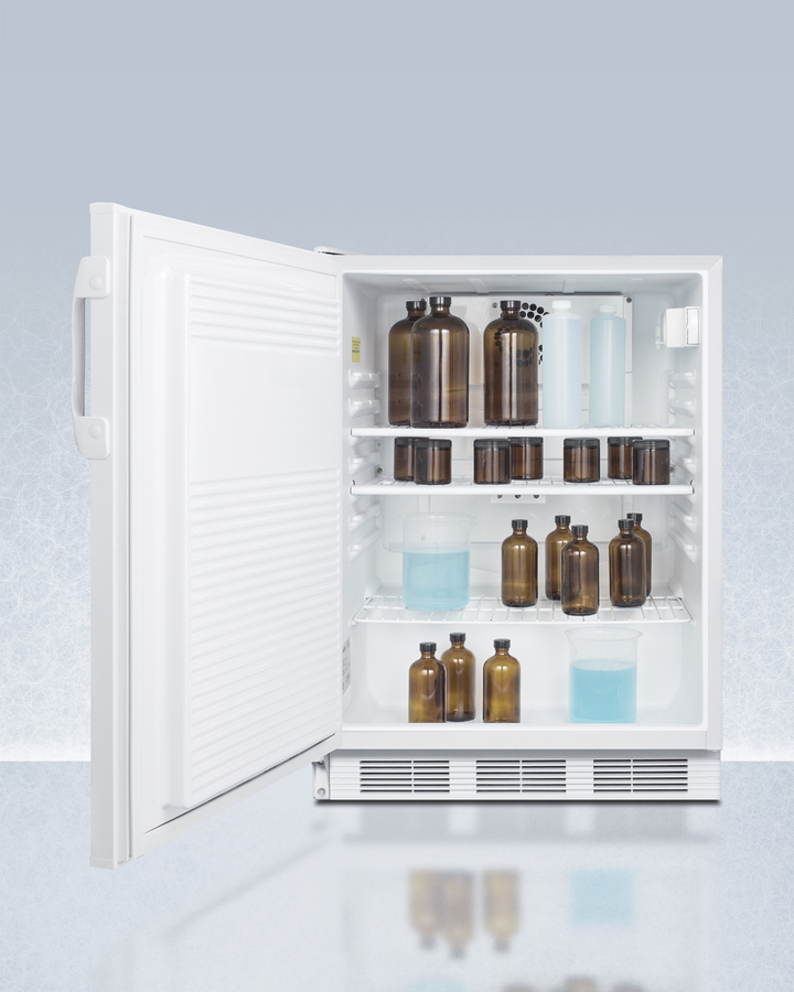 Accucold's series of general purpose refrigeration includes a variety of choices ideal for use in healthcare applications. The FF7LWGPCADALHD is a 32" high all-refrigerator designed to offer an improved performance over similarly sized dorm fridges and residential units. It comes in a slim 24 inch footprint with a large 5.5 cu.ft. interior. This model has a white exterior and left hand door swing. A factory installed front lock is located towards the top of the door to offer convenient security. Inside, the FF7LWPGCADALHD utilizes low maintenance automatic defrost operation. Our unique "hidden" evaporator is set behind the rear wall to create a seamless, easy-to-clean interior that also maximizes shelf space. This unit has a flat door liner that allows it to accept larger trays (up to 19 1/2" x 16"). Adjustable wire shelves allow users to reconfigure the interior to accommodate a variety of sizes. The interior light is controlled by an on/off rocker switch. An internal fan ensures proper cold air circulation throughout the unit. The FF7LWGPCADALHD is ETL-S listed to NSF-7 standards for use in commercial establishments. It is a convenient solution to general purpose cold storage applications. Additional general purpose choices are available as freezers and in undercounter, ADA compliant, and large capacity sizes. This unit is designed for general purpose or commercial applications and does not meet DOE energy standards for residential use. Note: Accucold's general purpose series refrigerators are intended for a wide variety of basic storage of non-critical products. For storage of high-value vaccines, life science materials, and medical or clinical biologicals, browse Accucold's Medical & Laboratory or Pharmacy & Vaccine Storage categories, or contact our product specialists to discuss your options at 1-888-4-MED-LAB.
