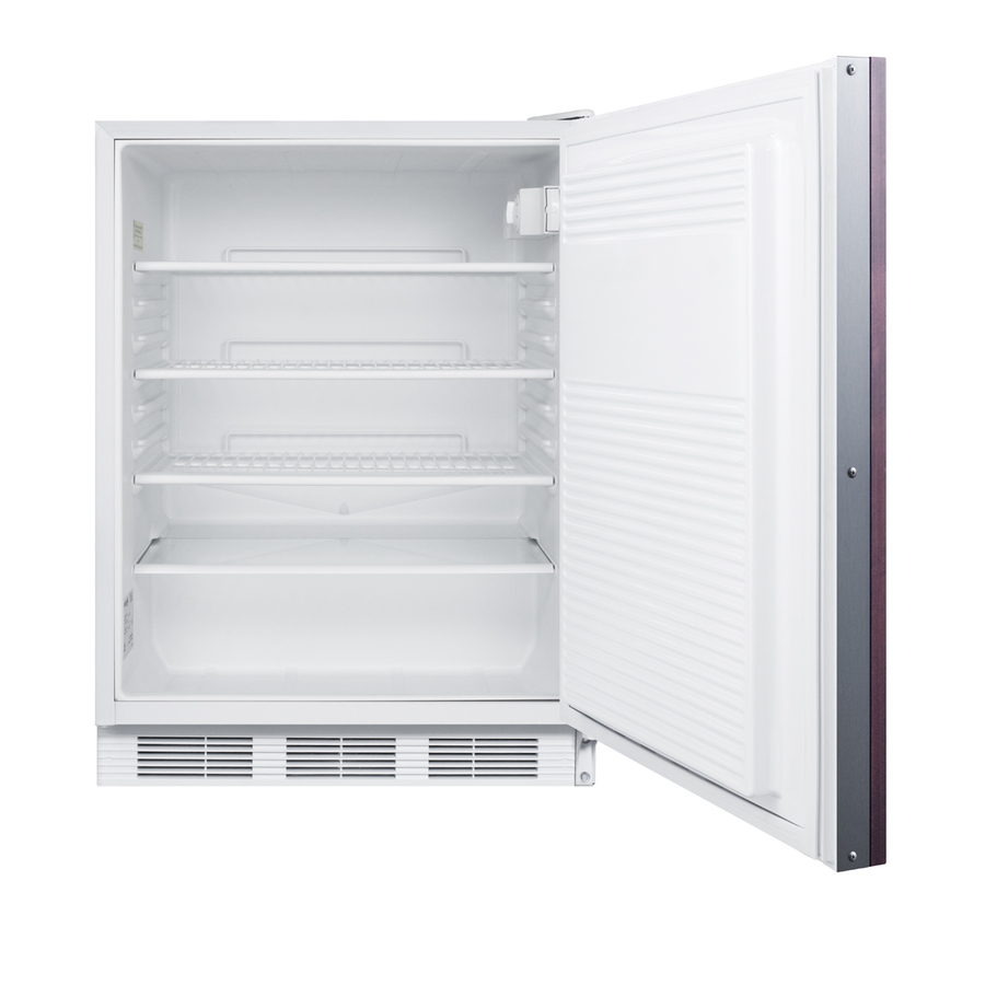 Accucold by Summit Appliance offers a wide range of all-refrigerators for general purpose storage. The commercially listed FF7BIADA Series features 24" wide all-refrigerators designed for built-in installation under lower ADA compliant counters. The FF7WBIIFADA is a 32" high all-refrigerator with a full 5.5 cu.ft. capacity inside a slim 24" footprint. The front-breathing design allows built-in use under counters, while the fully finished cabinet also lets this unit be used freestanding. This model has a white cabinet. The door includes an integrated stainless steel frame to accept overlay panels for a custom look. Users provide their own handle. Inside, the FF7WBIIFADA utilizes low maintenance automatic defrost operation. Our unique "hidden" evaporator is set behind the rear wall to create a seamless, easy-to-clean interior that also maximizes shelf space. This unit has a flat door liner that allows it to accept larger trays (up to 19 1/2" x 16"). Adjustable wire shelves allow users to reconfigure the interior to accommodate a variety of sizes. The interior light is controlled by an on/off rocker switch located behind the thermostat dial. The FF7WBIIFADA is ETL-S listed to NSF-7 standards for use in commercial establishments. For more finish options, browse the entire FF7BIADA Series. NOTE: This unit is designed for general purpose storage, including certain food items, beverages, specimens, reagents, cold packs, and other non-critical materials. For storage of high-value vaccines, life science materials, and medical or clinical biologicals, browse Accucold's Medical & Laboratory or Pharmacy & Vaccine Storage categories, or contact our product specialists to discuss your options.