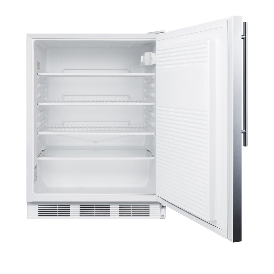 Accucold by Summit Appliance offers a wide range of all-refrigerators for general purpose storage. The commercially listed FF7BIADA Series features 24" wide all-refrigerators designed for built-in installation under lower ADA compliant counters. The FF7WBISSHVADA is a 32" high all-refrigerator with a full 5.5 cu.ft. capacity inside a slim 24" footprint. The front-breathing design allows built-in use under counters, while the fully finished cabinet also lets this unit be used freestanding. This model has a white cabinet and stainless steel wrapped door. A thin handle with a 14mm diameter completes the sleek, modern look. Inside, the FF7WBISSHVADA utilizes low maintenance automatic defrost operation. Our unique "hidden" evaporator is set behind the rear wall to create a seamless, easy-to-clean interior that also maximizes shelf space. This unit has a flat door liner that allows it to accept larger trays (up to 19 1/2" x 16"). Adjustable wire shelves allow users to reconfigure the interior to accommodate a variety of sizes. The interior light is controlled by an on/off rocker switch located behind the thermostat dial. The FF7WBISSHVADA is ETL-S listed to NSF-7 standards for use in commercial establishments. For more finish options, browse the entire FF7BIADA Series. NOTE: This unit is designed for general purpose storage, including certain food items, beverages, specimens, reagents, cold packs, and other non-critical materials. For storage of high-value vaccines, life science materials, and medical or clinical biologicals, browse Accucold's Medical & Laboratory or Pharmacy & Vaccine Storage categories, or contact our product specialists to discuss your options.