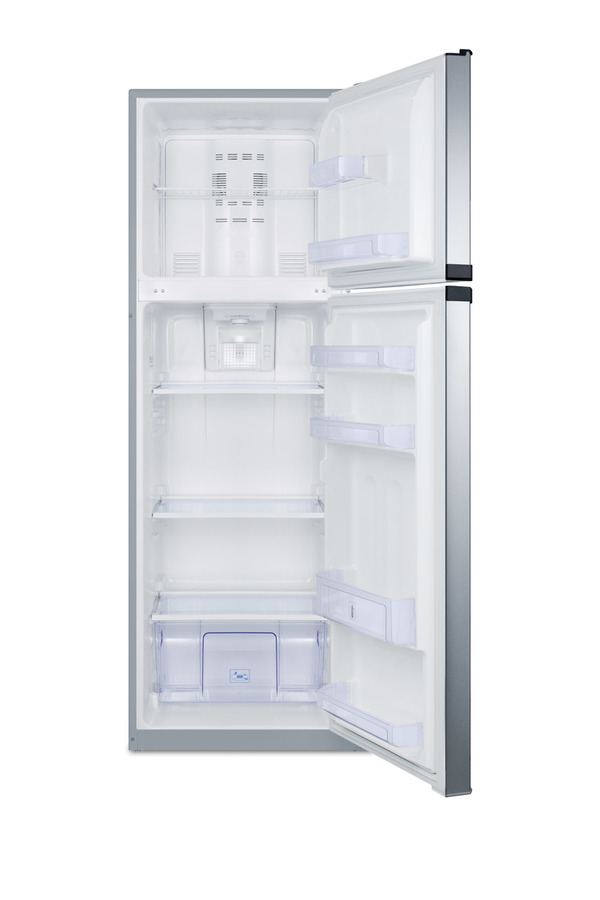 SUMMIT's thin-line collection of frost-free refrigerator-freezers brings quality and convenience to even the smallest kitchen space. The FF948SS offers a full 8.8 cu.ft. capacity inside a slim fit, with a unique curved door design for added style. The fresh food section includes adjustable glass shelves for spill-proof storage and easy cleaning, with a large tilt-out crisper and four door racks to help keep your refrigerator organized. The large freezer section includes a removable wire shelf and two door racks for added convenience. Made in North America, the FF948SS includes reversible stainless steel doors and a platinum cabinet. To add a factory installed icemaker, order FF948SSIM. For this unit in white, see the FF946W. NOTE: Because of this unit's curved door style, the FF948SS requires an additional 1 3/4" of width to open the doors to a full 90º. If placing this unit against a right angle wall, be sure to accommodate this extra space.