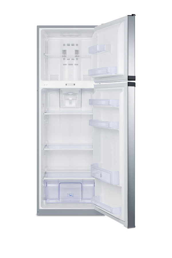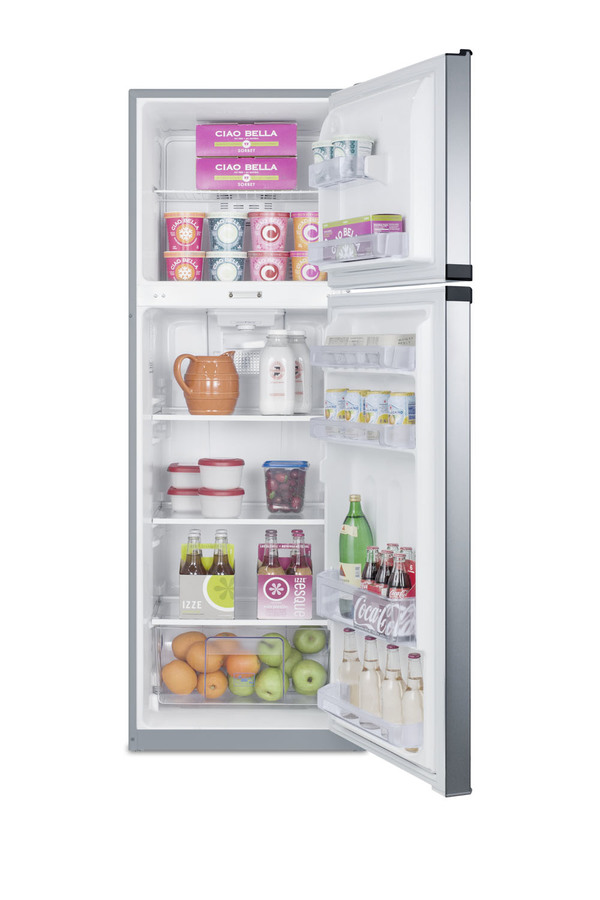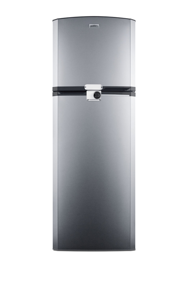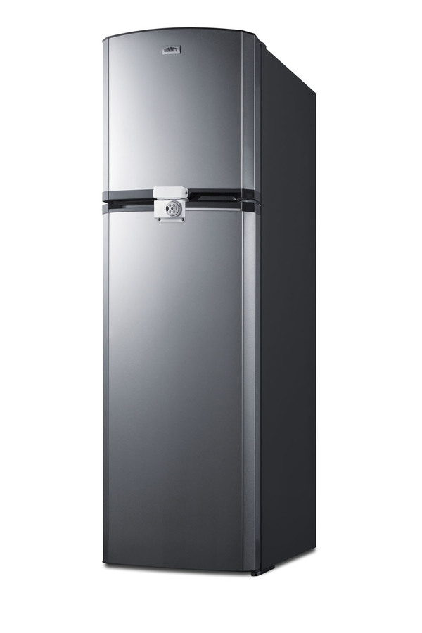 SUMMIT's thin-line collection of frost-free refrigerator-freezers brings quality and convenience to a variety of smaller kitchens, including break rooms and other institutional spaces. The FF948SSLLF2 offers a full 8.8 cu.ft. capacity inside a slim fit, with a unique curved door design for added style. The fresh food section includes adjustable glass shelves for spill-proof storage and easy cleaning, with a large tilt-out crisper and four door racks to help keep your refrigerator organized. The large freezer section features a removable wire shelf and two door racks for added convenience. Made in North America, the FF948SSLLF2 includes reversible stainless steel doors and a charcoal gray cabinet. A combination lock is factory-installed in the front to secure both sections. We include a key that can override the combination if needed. For this unit in white, see the FF946WLLF2. NOTE: Because of this unit's curved door style, the FF948SSLLF2 requires an additional 1 3/4" of width to open the doors to a full 90º. If placing this unit against a right angle wall, be sure to accommodate this extra space.