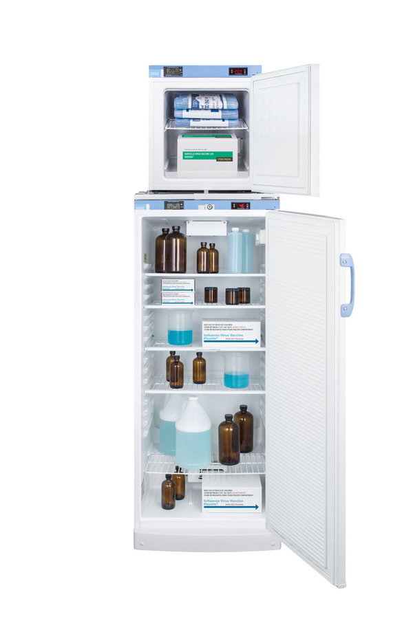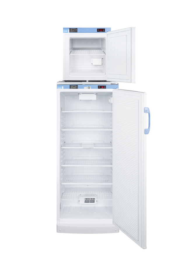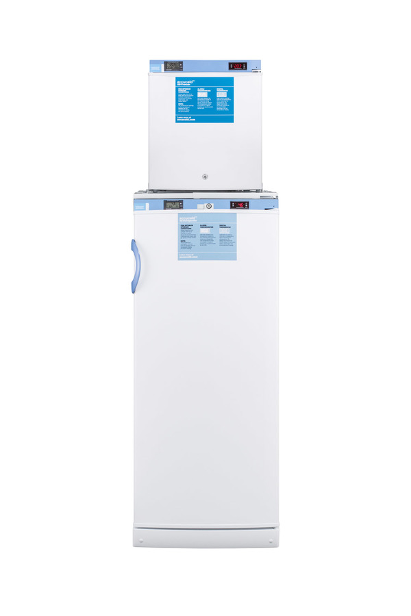 Accucold offers innovative solutions to vaccine storage with the STACKMED2 stackable refrigerator-freezer combination series. Sized just under 24" wide, the FFAR10-FS24LSTACKMED2 combines our full-sized FFAR10MED2 auto defrost all-refrigerator with the compact FS24LMED2 all-freezer in one slim footprint. Made in Europe, the FFAR10MED2 offers 10.1 cu.ft. of storage, with fan-forced cooling and adjustable wire shelves to ensure an even temperature distribution. The FS24LMED2 freezer utilizes static manual defrost cooling. Both units feature front-located control panels equipped with digital thermostats and NIST calibrated thermometers with high/low temperature alarms. Calibration is done in our ISO/IEC certified laboratory. The buffered temperature probes are encased in a glycol-filled bottle and secured inside the center shelf to best simulate the temperature of other stored contents, resulting in the utmost accuracy for temperature reporting. We include a pre-installed 3/8" probe hole for users who wish to install additional monitoring equipment in the rear of both units. Additional features include front locks and hospital grade cords. Products in the MED2 series come with a two year warranty on parts and labor and a five year warranty on the compressor. All Accucold STACKMED2 units ship in three boxes and require some minor assembly upon delivery. Additional stacked combinations can be created by ordering virtually any two units with our StackRack. These units can also be customized with a variety of refrigeration options, including NIST calibrated thermometers, USB data loggers, open door alarms, and much more. To create a custom combination, contact our sales team at 718-893-3900. *NOTE: Thermostats come pre-set for Celsius. If you prefer Fahrenheit, add complimentary option DTMEDF or let your sales representative know upon order.