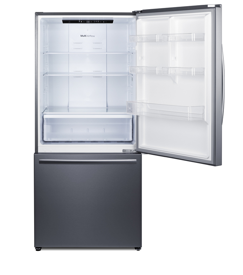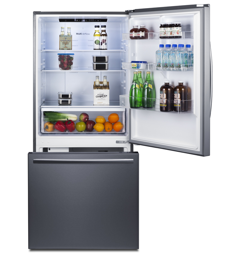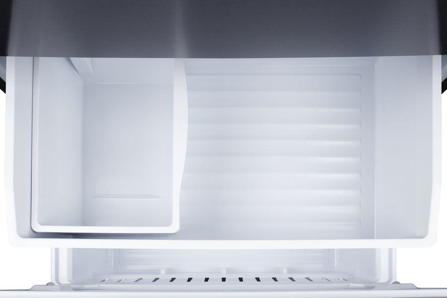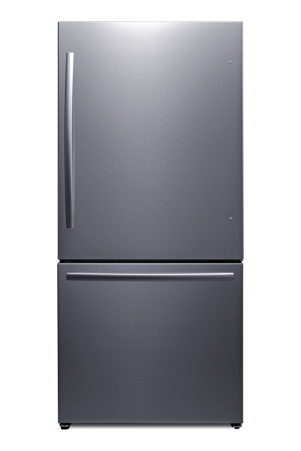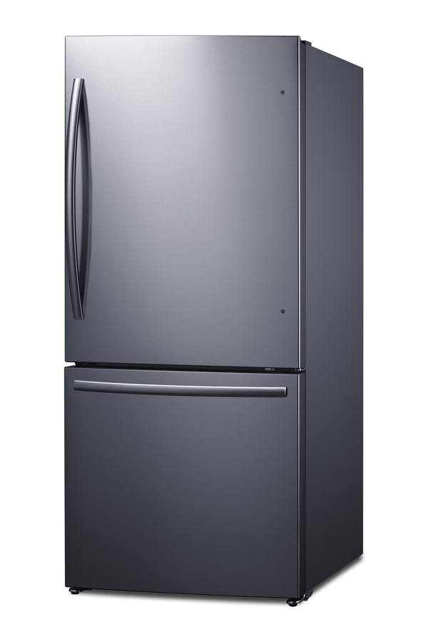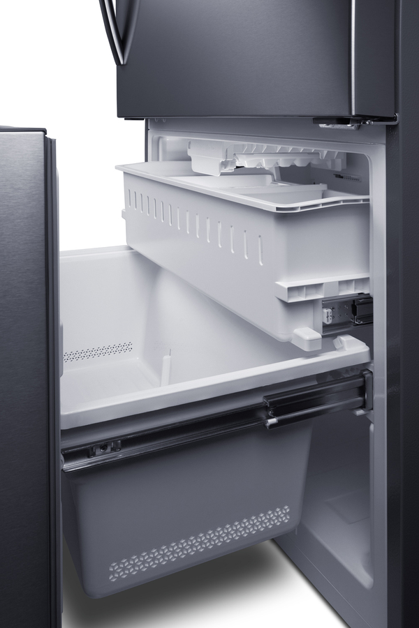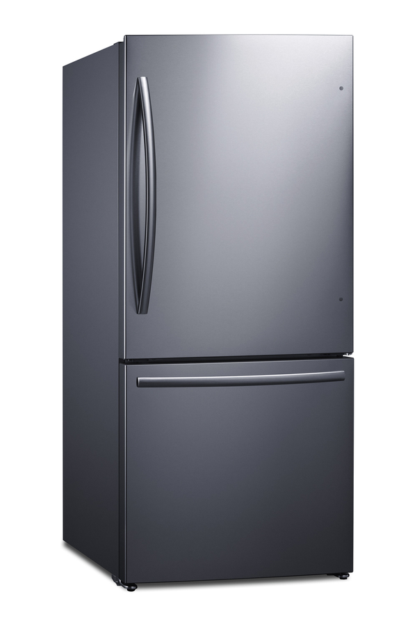 Summit's collection of counter-depth, bottom-mount refrigerator-freezers brings efficiency, reliability, and style to every kitchen. The ENERGY STAR certified FFBF179SSIM offers 17.2 cu.ft of storage capacity to meet full family needs. This unit features a user-reversible upper refrigerator door. The lower freezer compartment is a slide-out drawer with two levels of drawer storage, ensuring easy access and organization. Both sections include pro-style handles in a curved design. This unit comes with a textured gray cabinet and real stainless steel doors featuring a horizontal grain and protective film that helps to keep the door clean from fingerprints and smudges. The right angle plug and sealed back help to ensure a better fit. Inside, the FFBF179SSIM comes fully featured for maximum storage convenience with frost-free operation ideal for minimum maintenance. The refrigerator section includes two adjustable glass shelves. On the door, four half-sized adjustable door racks offer additional storage options, in addition to one full-width rack that can accommodate gallon-sized containers. The large, full-width clear crisper is ideal for keeping produce fresh. An innovative touch control system lets you manage both the refrigerator and freezer temperature with an intuitive digital thermostat. LED lighting offers an efficient and attractive view inside. The open door alarm alerts with an audio and visual signal when the door is left ajar for over two minutes. This model's refrigerator also features a SuperCool function, ideal for cooling fresh foods quickly. The lower freezer compartment's upper drawer features a factory-installed icemaker that keeps a full supply of crescent-shaped ice on hand. The SuperFreeze function is ideal for bringing newly loaded groceries to freezing temperature quickly. Made in North America, the FFBF179SSIM is the perfect energy-efficient addition to any kitchen. Additional bottom mount, French door, and top mount refrigerator-freezers are available. Browse the full Summit lineup to complete your space with style and efficiency.