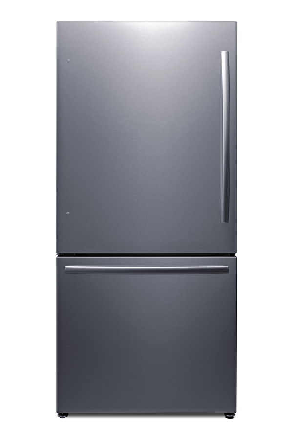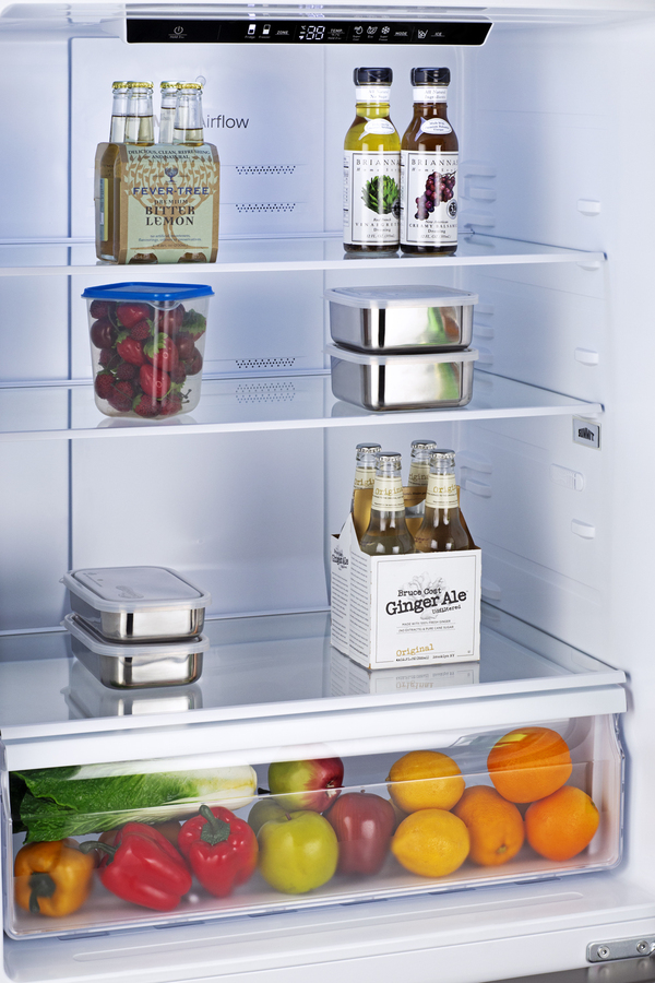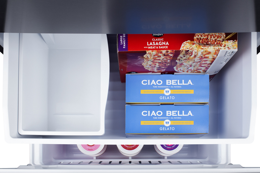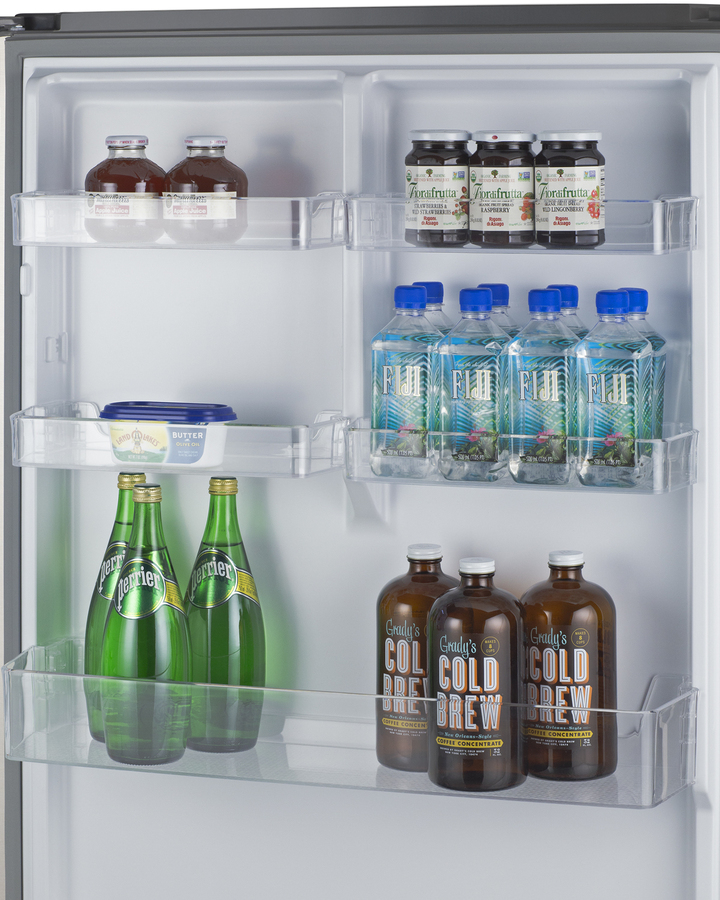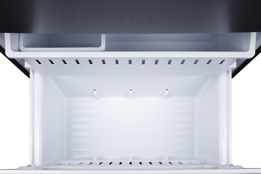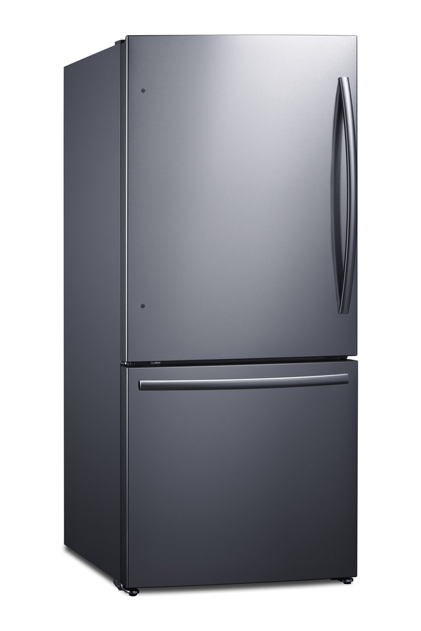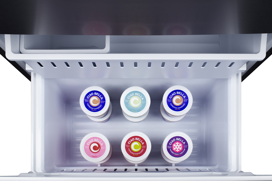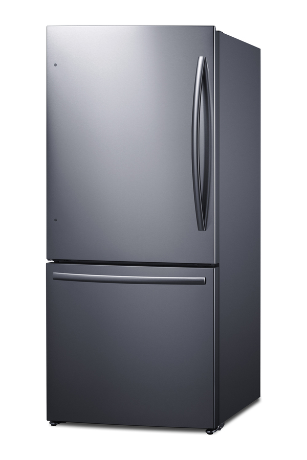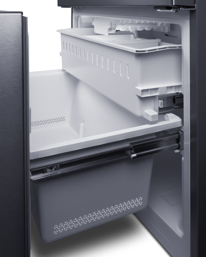 Summit's collection of counter-depth, bottom-mount refrigerator-freezers brings efficiency, reliability, and style to every kitchen. The ENERGY STAR certified FFBF179SSIMLHD offers 17.2 cu.ft of storage capacity to meet full family needs. The top-mounted refrigerator comes with a left hand door swing. The lower freezer compartment is a slide-out drawer with two levels of drawer storage, ensuring easy access and organization. Both sections include pro-style handles in a curved design. This unit comes with a textured gray cabinet and real stainless steel doors featuring a horizontal grain and protective film that helps to keep the door clean from fingerprints and smudges. The right angle plug and sealed back help to ensure a better fit. Inside, the FFBF179SSIMLHD comes fully featured for maximum storage convenience with frost-free operation ideal for minimum maintenance. The refrigerator section includes two adjustable glass shelves. On the door, four half-sized adjustable door racks offer additional storage options, in addition to one full-width rack that can accommodate gallon-sized containers. The large, full-width clear crisper is ideal for keeping produce fresh. An innovative touch control system lets you manage both the refrigerator and freezer temperature with an intuitive digital thermostat. LED lighting offers an efficient and attractive view inside. The open door alarm alerts with an audio and visual signal when the door is left ajar for over two minutes. This model's refrigerator also features a SuperCool function, ideal for cooling fresh foods quickly. The lower freezer compartment's upper drawer features a factory-installed icemaker that keeps a full supply of crescent-shaped ice on hand. The SuperFreeze function is ideal for bringing newly loaded groceries to freezing temperature quickly. Made in North America, the FFBF179SSIMLHD is the perfect energy-efficient addition to any kitchen. Additional bottom mount, French door, and top mount refrigerator-freezers are available. Browse the full Summit lineup to complete your space with style and efficiency.