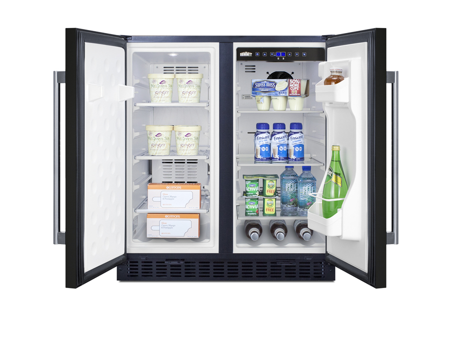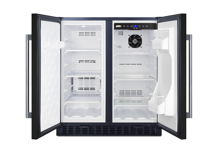 SUMMIT brings quality and value under the counter with the industry’s largest collection of built-in refrigeration. Sized at 30" wide, the FFRF3070B is an all-in-one side-by-side refrigerator-freezer. The front breathing design allows built-in installation under counters, while the fully finished cabinet also enables freestanding use. This unit features a jet black exterior with stainless steel handles. Each compartment has a factory installed front lock for added security. The sealed back ensures easier cleanup with added space savings. Inside, the FFRF3070B features a 2.4 cu.ft. frost-free freezer compartment on the left and a 3 cu.ft. frost-free refrigerator compartment on the right. The refrigerator includes a digital thermostat allowing users to manage the temperature in each compartment, with a readout in Celsius or Fahrenheit for added convenience. Adjustable glass shelves offer cleaner spill-proof storage for fresh food items, while two removable door shelves provide additional storage space as needed. An internal fan assures the compartment is cooled evenly from top to bottom. The freezer compartment includes adjustable wire shelves to ensure proper cold air circulation. Both sides feature LED lighting to provide an attractive, energy efficient presentation. The slotted floor design is ideal for keeping bottles safely in place. Additional features include an open door alarm, high temperature alarm, and Sabbath mode setting that allows you to disable certain functions during religious observance. With its innovative all-in-one design, user-friendly features, and full frost-free operation, the FFRF3070B is a great choice for smaller kitchens looking to maximize storage space under the counter.