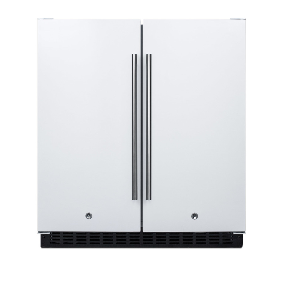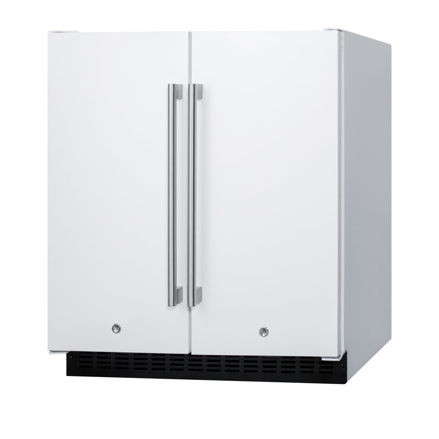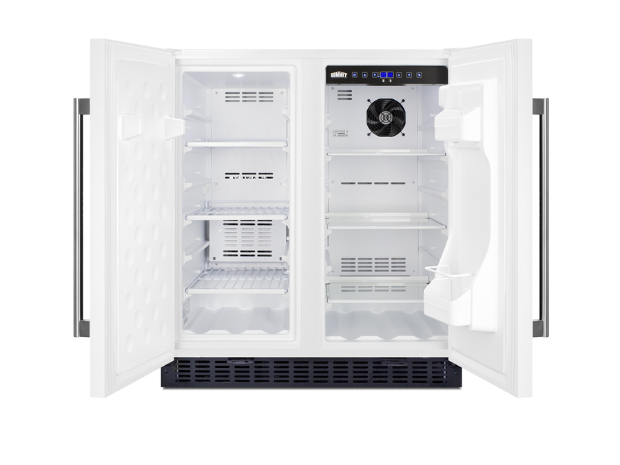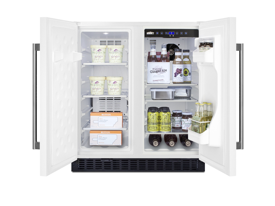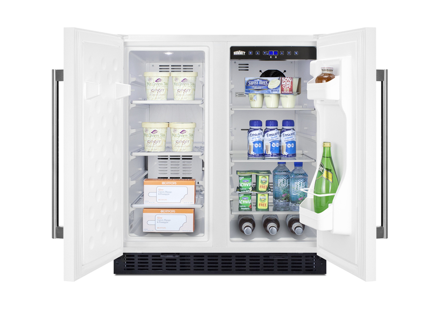 SUMMIT brings quality and value under the counter with the industry’s largest collection of built-in refrigeration. Sized at 30" wide, the FFRF3075W is an all-in-one side-by-side refrigerator-freezer. The front breathing design allows built-in installation under counters, while the fully finished cabinet also enables freestanding use. This unit features a white exterior with stainless steel handles. Each compartment has a factory installed front lock for added security. The sealed back ensures easier cleanup with added space savings. Inside, the FFRF3075W features a 2.4 cu.ft. frost-free freezer compartment on the left and a 3 cu.ft. frost-free refrigerator compartment on the right. The refrigerator includes a digital thermostat allowing users to manage the temperature in each compartment, with a readout in Celsius or Fahrenheit for added convenience. Adjustable glass shelves offer cleaner spill-proof storage for fresh food items, while two removable door shelves provide additional storage space as needed. An internal fan assures the compartment is cooled evenly from top to bottom. The freezer compartment includes adjustable wire shelves to ensure proper cold air circulation. Both sides feature LED lighting to provide an attractive, energy efficient presentation. The slotted floor design is ideal for keeping bottles safely in place. Additional features include an open door alarm, high temperature alarm, and Sabbath mode setting that allows you to disable certain functions during religious observance. With its innovative all-in-one design, user-friendly features, and full frost-free operation, the FFRF3075W is a great choice for smaller kitchens looking to maximize storage space under the counter.