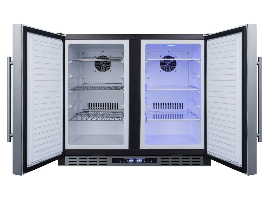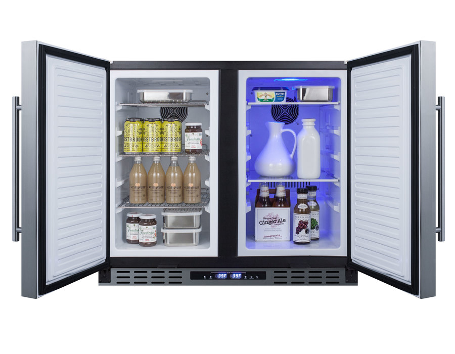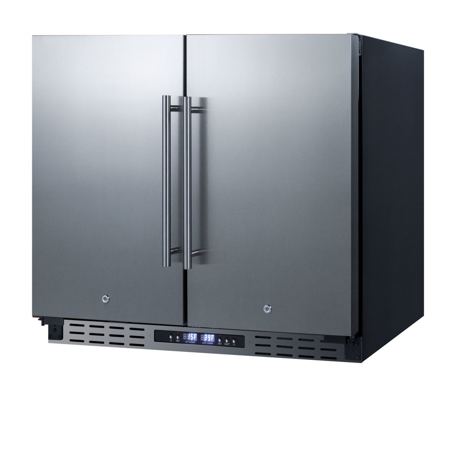 SUMMIT brings quality and value under the counter with the industry’s largest collection of ADA compliant built-in refrigeration. The FFRF36ADA features a versatile design that meets NSF-7 and UL-471 commercial standards but is also approved for residential use. Sized at 36" wide, this all-in-one, side-by-side refrigerator-freezer is designed for built-in or freestanding installation. This unit features a jet black cabinet and stainless steel doors complete with pro style handles. Both sections include factory-installed keyed locks for added security. Digital controls are located in the kickplate, allowing you to adjust the temperature without opening the door. This unit has a sealed back design to enable easier cleanup and added space savings. Inside, the FFRF36ADA features a 2.9 cu.ft. frost-free freezer compartment on the left and a 2.9 cu.ft. frost-free refrigerator compartment on the right. Both sections are frost-free for easy maintenance, with internal fans to help provide even cooling. The refrigerator compartment includes three adjustable glass shelves with five placement options that offer multiple spill-proof storage options. The freezer compartment includes three adjustable chrome shelves, with five placement options for optimal storage options and proper cold air circulation. The freezer compartment includes three adjustable chrome shelves for proper cold air circulation. Additionally, the freezer section can be converted to run as a refrigerator, allowing you to adjust the temperature range to best accommodate your storage needs at the touch of a button. The FFRF36ADA is sized at 31 1/2 inches high to fit under lower ADA compliant counters. For this unit with panel ready doors, see the FFRF36IFADA. NOTE: Due to its larger commercial design, the FFRF36ADA requires an additional 5/8" of width for each door to open to a full 90º. If placing this unit against a right angle wall, be sure to accommodate this extra space.