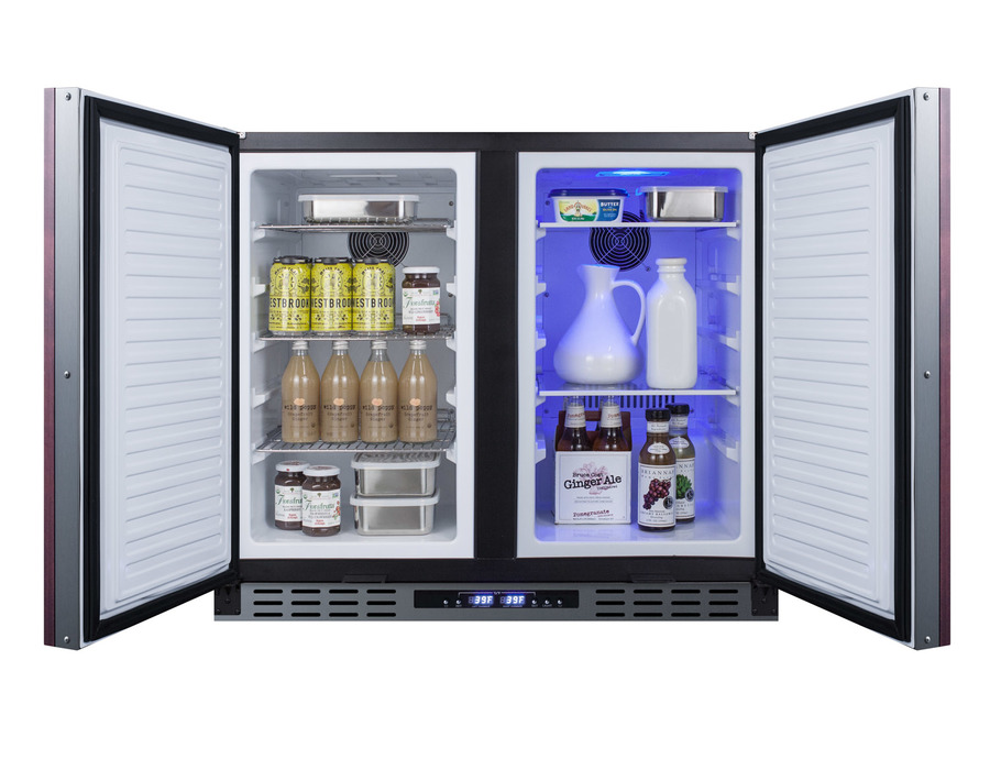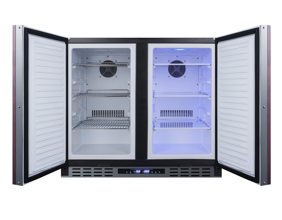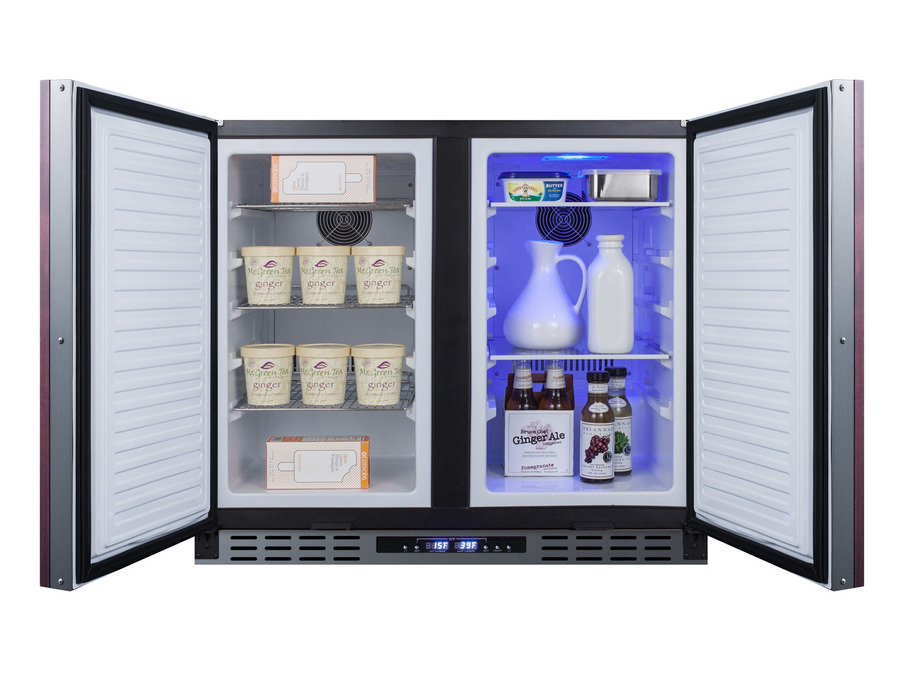 SUMMIT brings quality and value under the counter with the industry’s largest collection of ADA compliant built-in refrigeration. The FFRF36IFADA features a versatile design that meets NSF-7 and UL-471 commercial standards but is also approved for residential use. Sized at 36" wide, this all-in-one, side-by-side refrigerator-freezer is designed for built-in or freestanding installation. The two doors feature an integrated stainless steel frame designed to accept full panel overlays, allowing users to seamlessly blend the unit into their own cabinetry design (panel size: 27 7/8" H x 17 9/16" W; 3/4" thick with a maximum weight of 10 lbs.). Users must supply their own door handle. A stainless steel kickplate adds elegance to any space. The digital controls are located in the kickplate, allowing you to adjust the temperature without opening the door. This unit has a sealed back design to enable easier cleanup and added space savings. Inside, the FFRF36IFADA features a 2.9 cu.ft. frost-free freezer compartment on the left and a 2.9 cu.ft. frost-free refrigerator compartment on the right. Both sections are frost-free for easy maintenance, with internal fans to help provide even cooling. The refrigerator compartment includes three adjustable glass shelves with five placement options that offer multiple spill-proof storage options. The freezer compartment includes three adjustable chrome shelves for proper cold air circulation. Additionally, the freezer section can be converted to run as a refrigerator, allowing you to adjust the temperature range to best accommodate your storage needs at the touch of a button. The FFRF36ADA is sized at 31 5/8 inches high to fit under lower ADA compliant counters. For this unit in standard height, see the FFRF36IF. NOTE: Due to its larger commercial design, the FFRF36IFADA requires an additional 5/8" of width for each door to open to a full 90º. If placing this unit against a right angle wall, be sure to accommodate this extra space.
