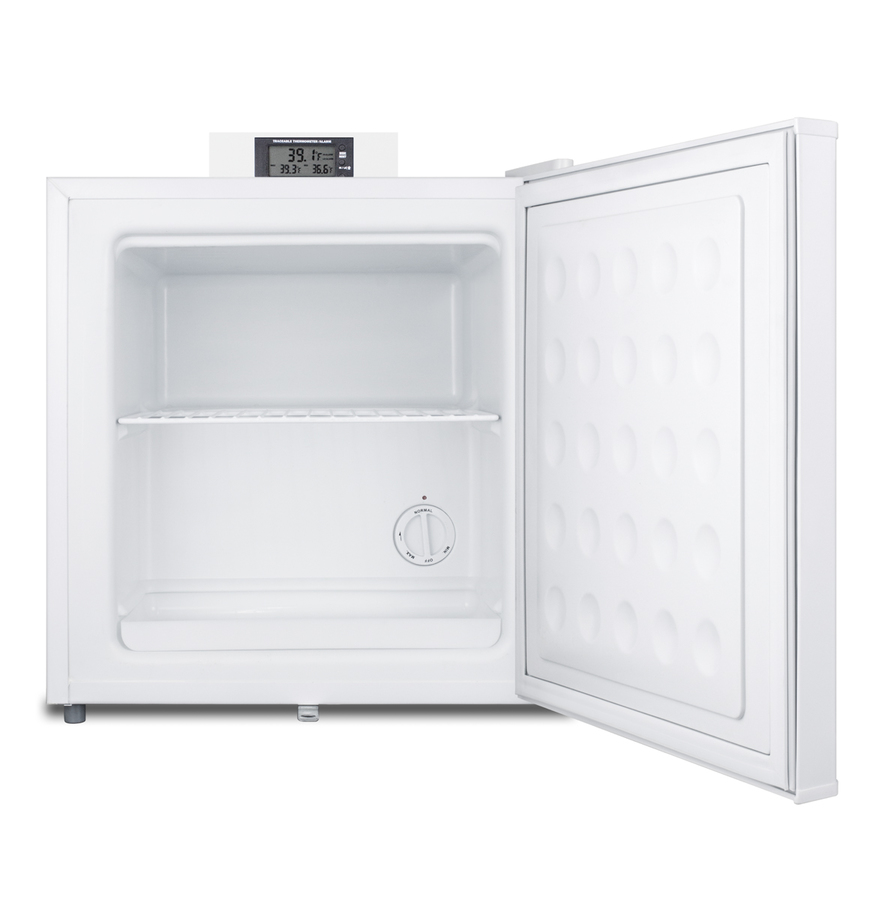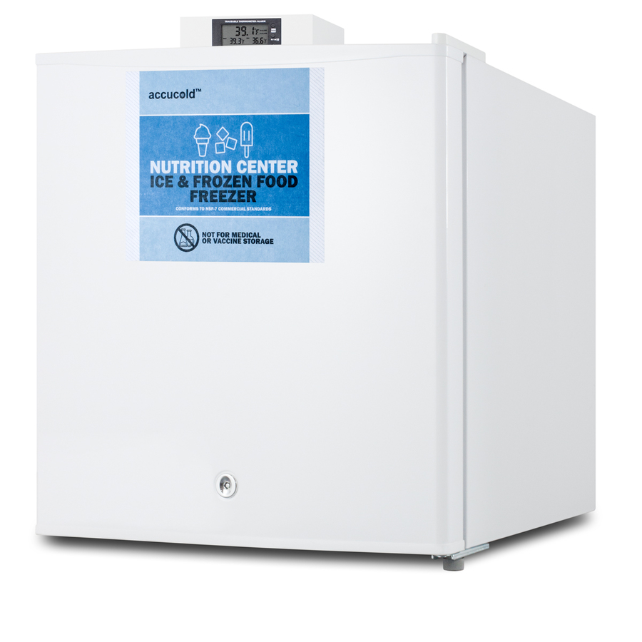 Accucold's Nutrition Center Series features commercially approved refrigerators and freezers specifically designed for the storage of sealed food and beverages in a variety of facilities, including break rooms, waiting areas, nurses' stations, and more. The FS24L7NZ is a compact all-freezer sized for countertop use. It is ETL-S listed to NSF-7 standards for the storage of sealed food and beverages. The top cabinet includes a factory installed digital thermometer that provides a continuous external display of the current and minimum/maximum temperature to the nearest tenth of a degree, making it easier for staff to monitor and record the temperature as needed. This device includes a built-in audible alarm that will sound if the unit rises or falls out of the set temperature range. The temperature probe is encased in a glycol-filled bottle to best simulate the temperature of stored contents. All temperature display devices are calibrated to NIST standards in our ISO/IEC 17025:2017 laboratory and include a certificate of calibration. Inside, the FS24L7NZ utilizes manual defrost operation. It includes adjustable wire shelves for flexible storage, with a flat door liner to maximize interior depth. The dial thermostat is located inside. A one-piece interior liner ensures easier cleanup. The FS24L7NZ comes in a white exterior finish. The user-reversible door includes a front lock for added security. This unit includes a hospital grade cord with a 'green dot' plug that stays more securely in wall sockets, a key feature in busy institutional settings. Designed specifically for institutional food and beverage storage, all Accucold's Nutrition Centers are commercially approved to NSF standards and comply with most JCAHO recommendations for safe storage. Additional sizes and variations are available.