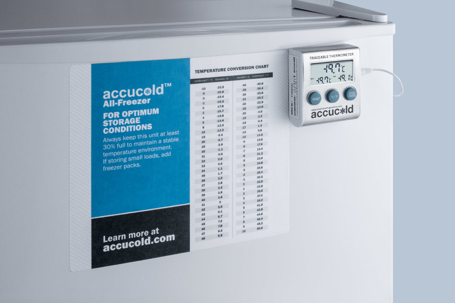 The FS24LPLUS2 is a compact all-freezer designed to fit easily on top of counters. It comes in a white exterior finish. The door includes a factory-installed lock and a thermometer calibrated to NIST standards in our ISO/IEC 17025:2017 laboratory. It displays the current, minimum, and maximum temperature to the nearest tenth degree viewable in Celsius or Fahrenheit. The buffered temperature probe is stored in a glycol-filled bottle to ensure the temperature reading best reflects the temperature of other stored freezer contents. Inside, the FS24LPLUS2 offers a 1.4 cu.ft. capacity. Manual defrost utilizes static cooling to help improve temperature stability. A removable wire shelf offers storage convenience and the flat door liner conforms with the CDC's guidelines for vaccine storage. The seamless interior liner helps to simplify cleanup. Accucold's PLUS2 series freezers are intended for a wide variety of basic storage only. Storage of high-value vaccines, life science materials, medical, or clinical biologicals require a product with design features including, but not limited to tighter temperature controls, monitoring, and/or back-up.